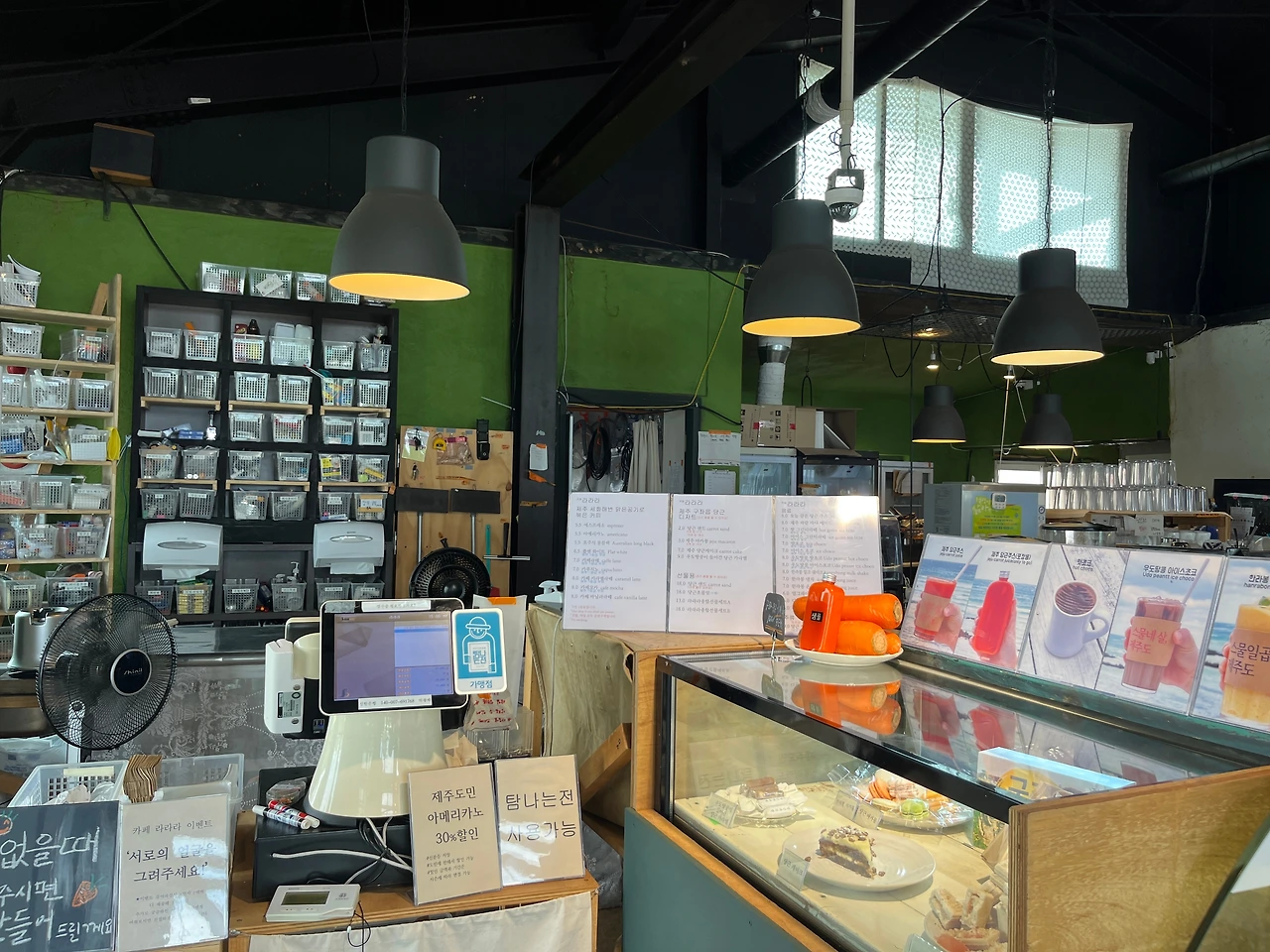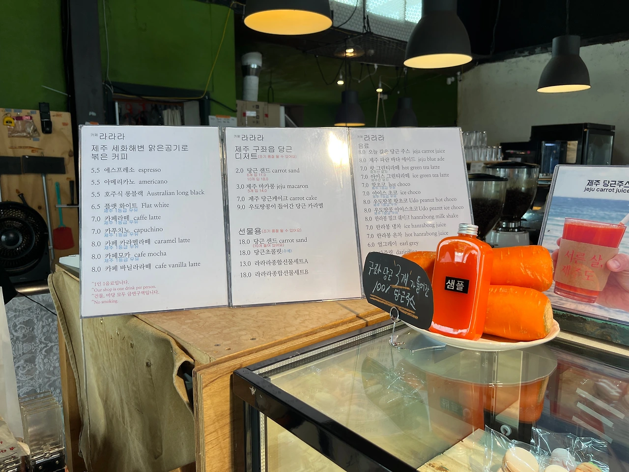 우리는 카운터로 가서 메뉴판을 확인했다. 다양한 커피 메뉴와 '구좌 당근 3개가 들어간 100% 당근주스'가 눈에 띄었다. 쇼케이스에 진열된 마카롱과 당근 케이크도 맛있어 보였다. 팀장님은 당근주스를 주문하셨다. 나도 이곳에서는 당근주스를 시켜보고 싶었다.