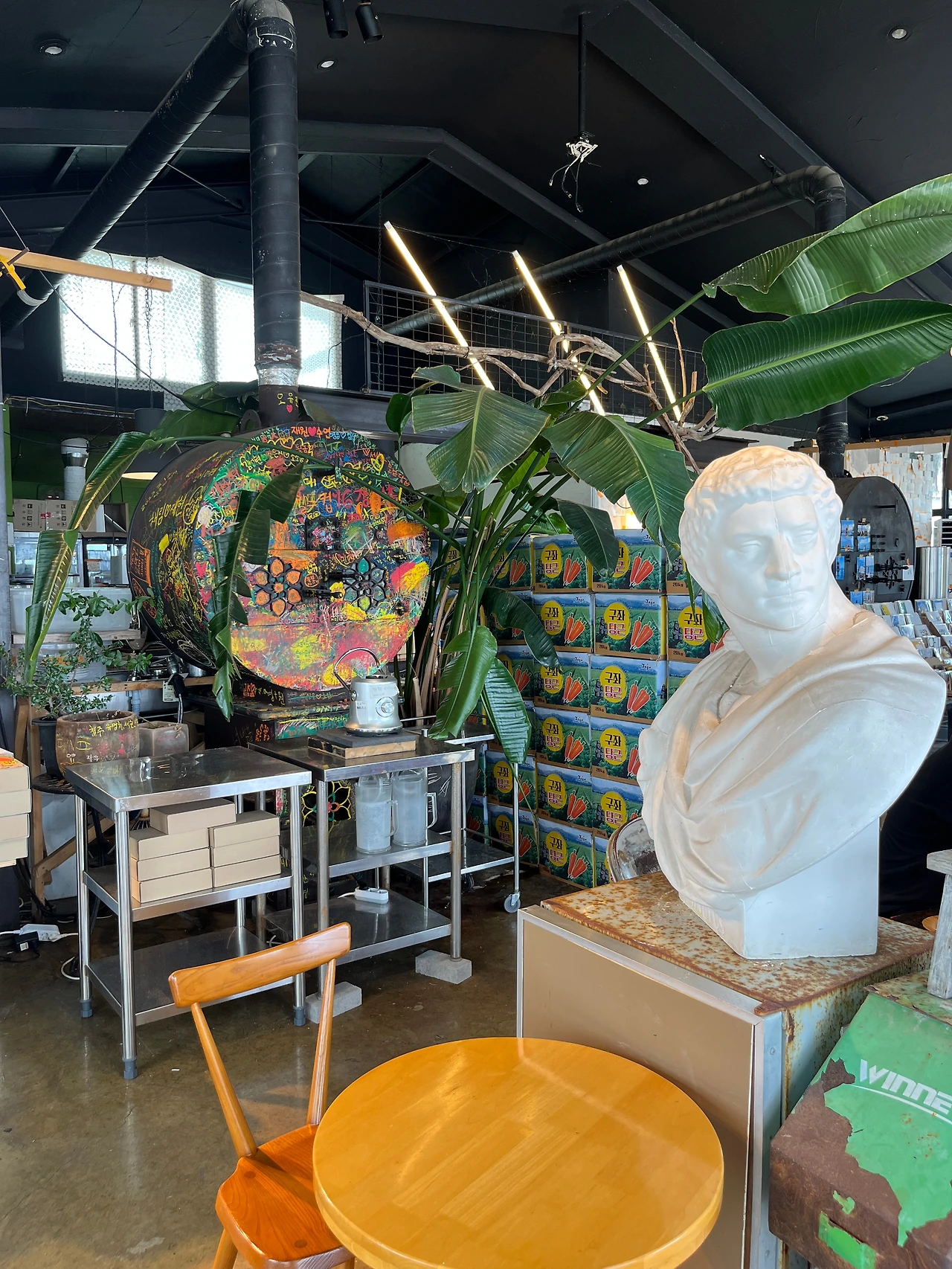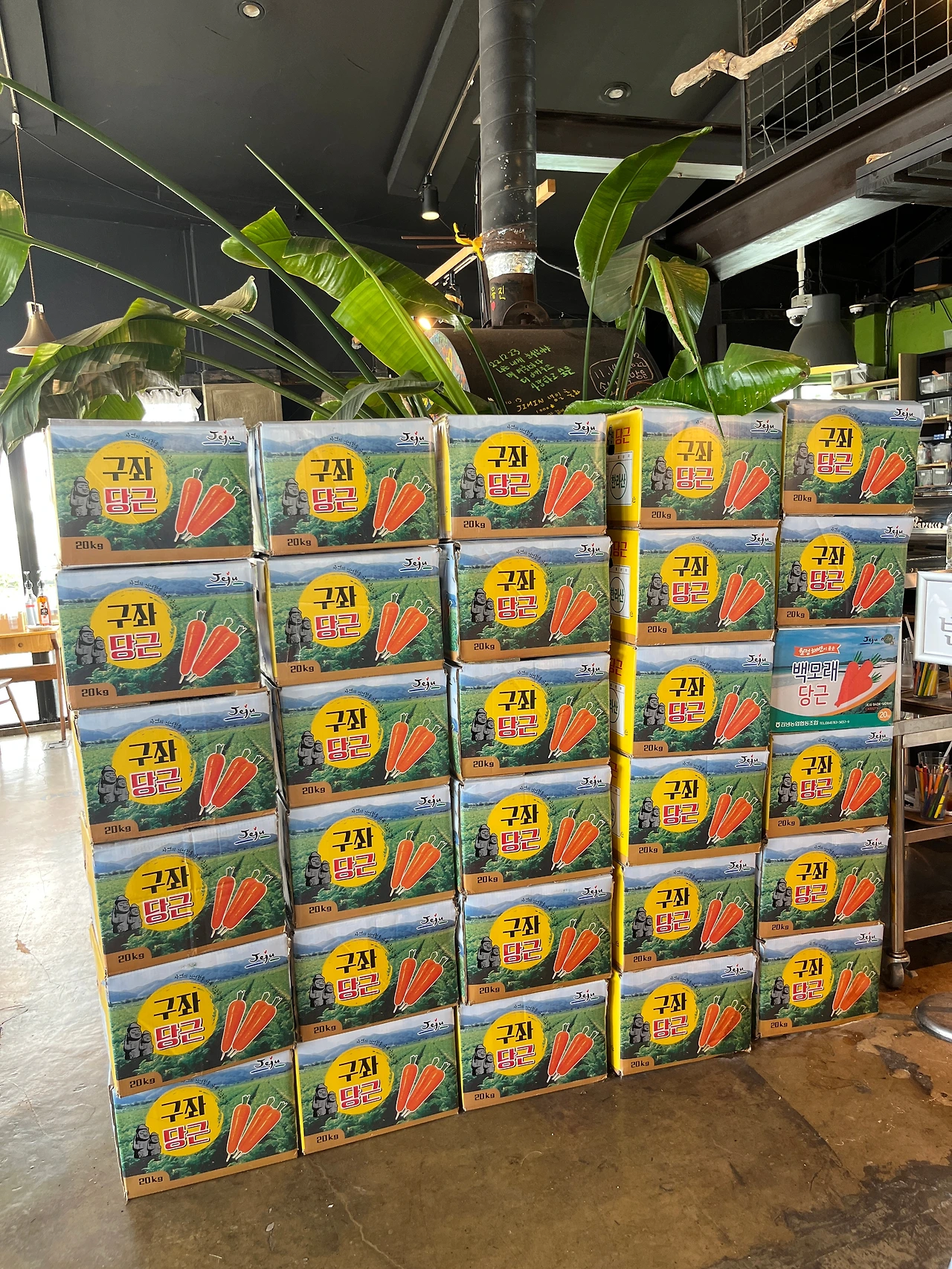 카페 한가운데는 이곳이 리얼 구좌당근을 쓰는 카페라는 것을 인증하듯이 20kg짜리 구좌당근 박스를 잔뜩 쌓아서 제주 감성을 자극했다.
