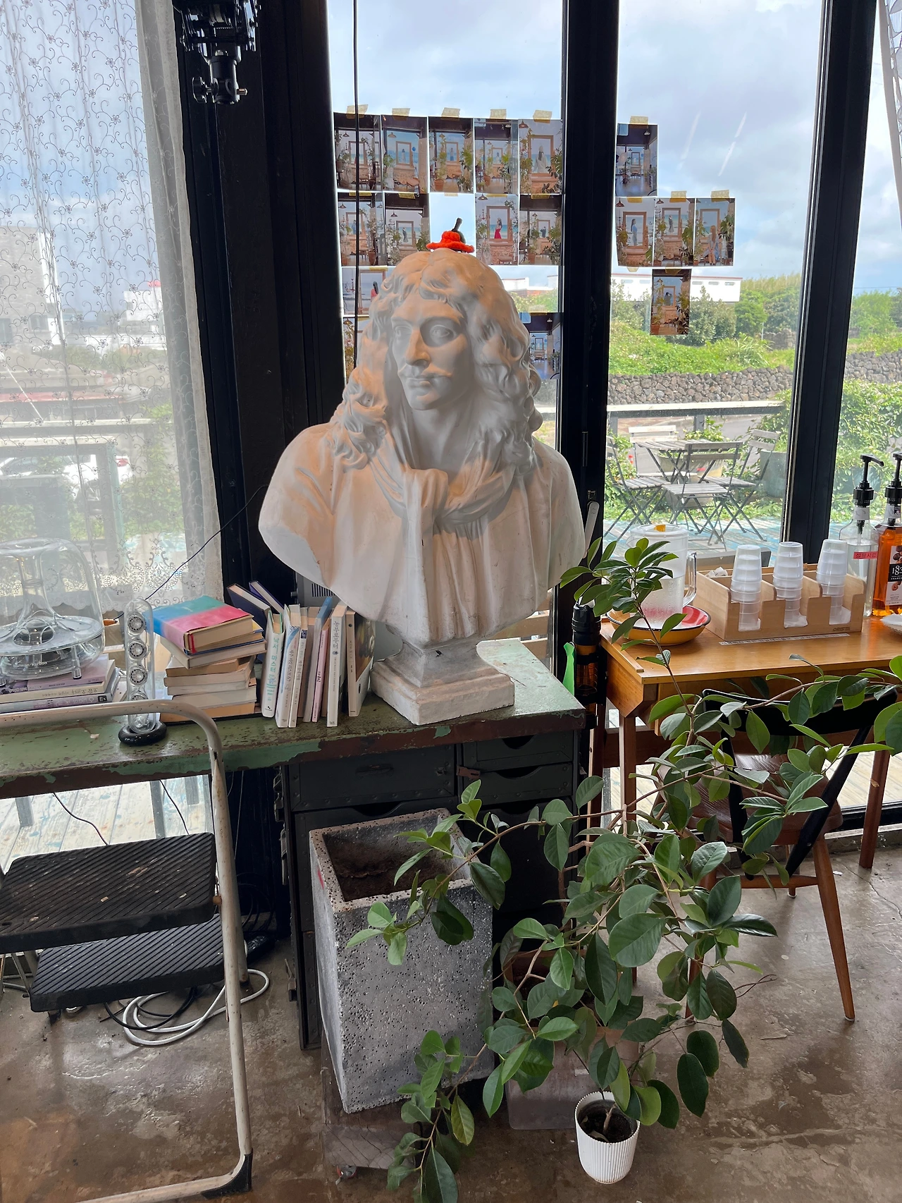 카페 입구는 낡은 자전거와 빨간 우체통, 사진을 찍을 수 있는 액자 모형이 진열되어 있었다. 액자 뒤로 보이는 세화해수욕장이 제주 감성을 더해주는 것 같았다.