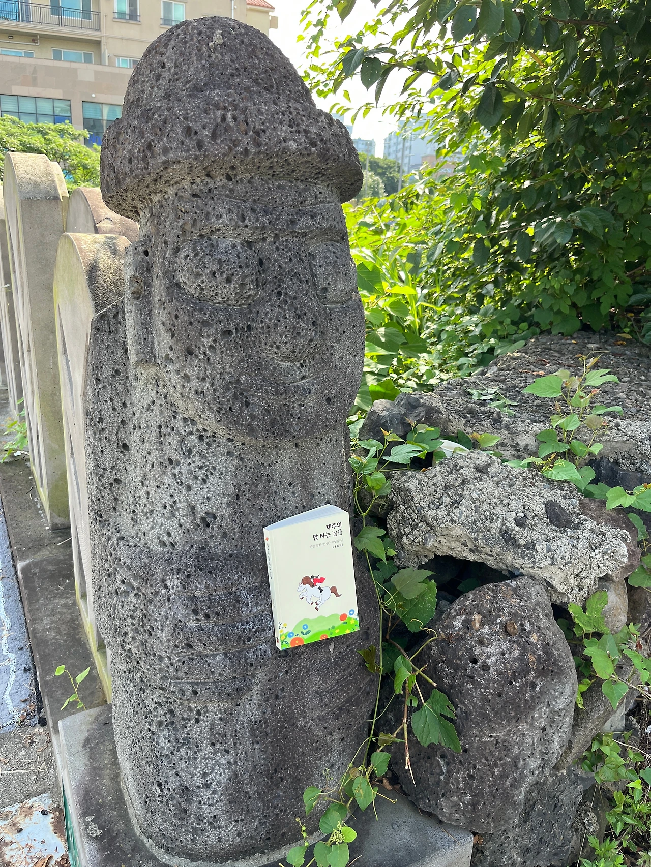 집으로 가는 길에 다리 위 하르방이 눈에 띄었다. 나는 하르방의 손에 책을 올리고 사진을 찍어 보았다.