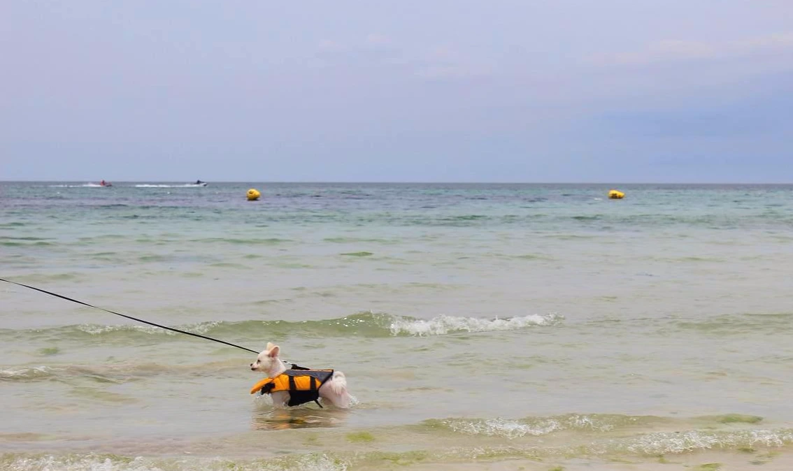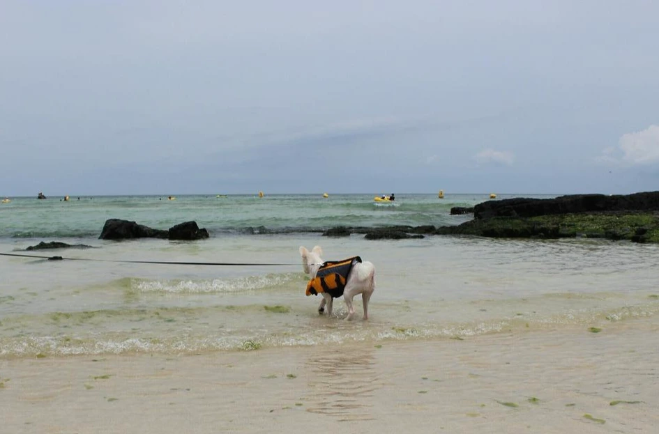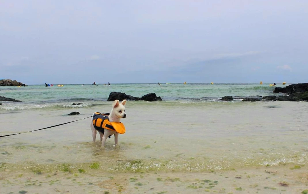 월정리 바다는 수심이 얕은 편이어서 겁많은 강아지들과 놀기에 적당해요.