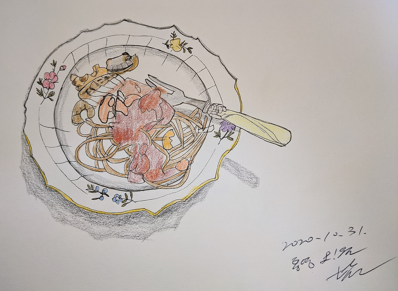 차례차례 고운 접시 따라 꽃단장 연하게 한 듯