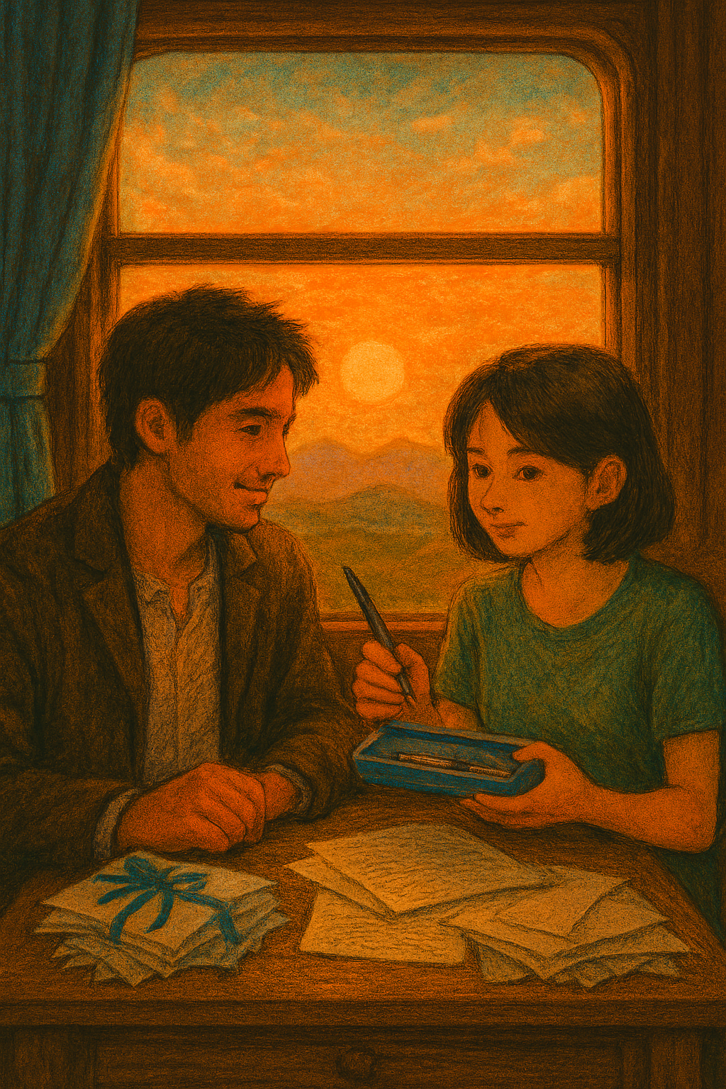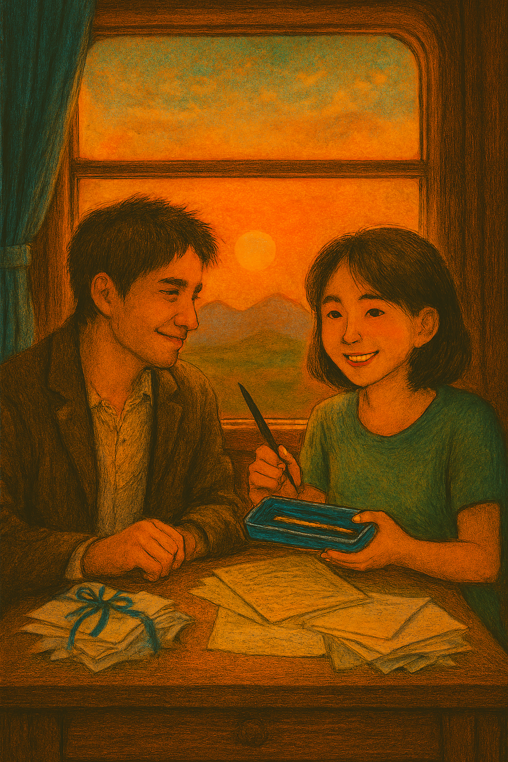 사라지고 만 만년필은 오랜 시간 우리를 이어주다가, 이제는 달리는 마법 열차 안 내 오래된 나무 책상 서랍 속에 들어 있어요.