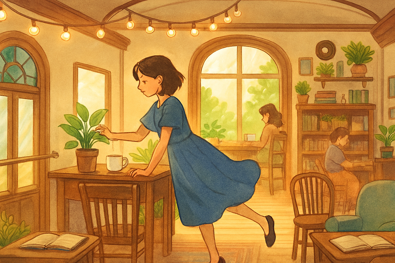 초록색 식물이 심긴 화분이 곳곳에 놓인 널찍한 나무 책상에는, 김이 모락모락 올라오거나 얼음이 달그락 소리를 내는 카페라떼가 올려져 있어요.