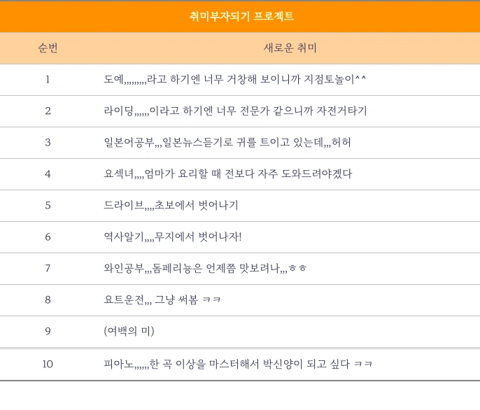 대단히 대단해 보이는 습관이나 원칙 말고도 쓸 수 있습니다. 취미는 어떤가요? 다른 사람들과 취미를 글로 공유하는 일로 취미 부자의 반열에 들어갑시다. “취미가 무엇입니까. 책 읽기입니다.” 빨리 쓰면서도 행복한 글쓰기가 됩니다.