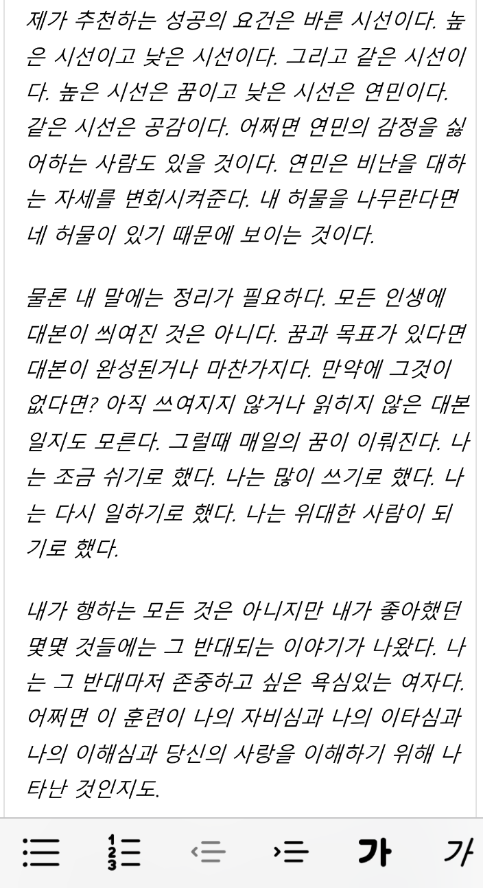 그리고 그와 비슷한 일은 잠에서 깨어난 뒤에 또 한 번 일어났다. 이번엔 한 문장이 아니라 여러 문장을 쓰고 있었다. 그때 많은 필사를 했기 때문에 누군가의 멋진 글을 따라 쓴 것인지 헷갈릴 만큼 '출처가 없는 그 글'을 사랑했다. 과연 이게 내가 쓴 것이 맞는지 알 수 없었던 것도 희한한 일이지만 (보통은 누가 썼는지 적는다.) 그렇게 쓰인 글이 내 인생에 best of best 가 되어주었기 때문이다. 여전히 내가 쓴 게 맞는지 알아내기 위해 가끔씩 그 문장을 검색해 보곤 하는데 아직까지 출처를 찾을 수 없었다.