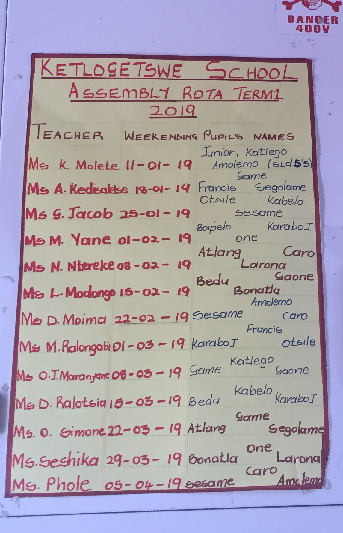 조회를 담당할 교사와 학생들의 순서가 게시판에 안내되어 있어요