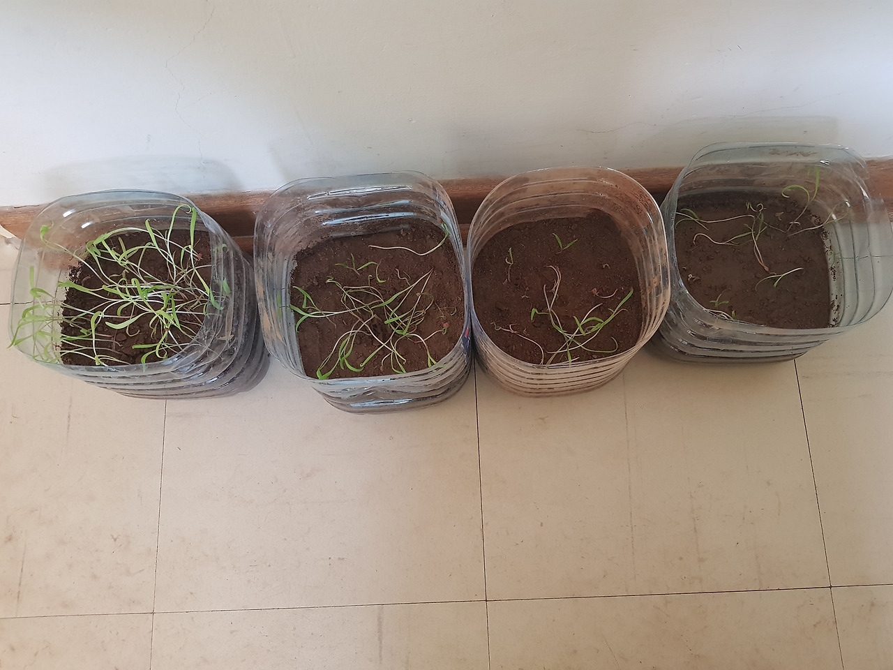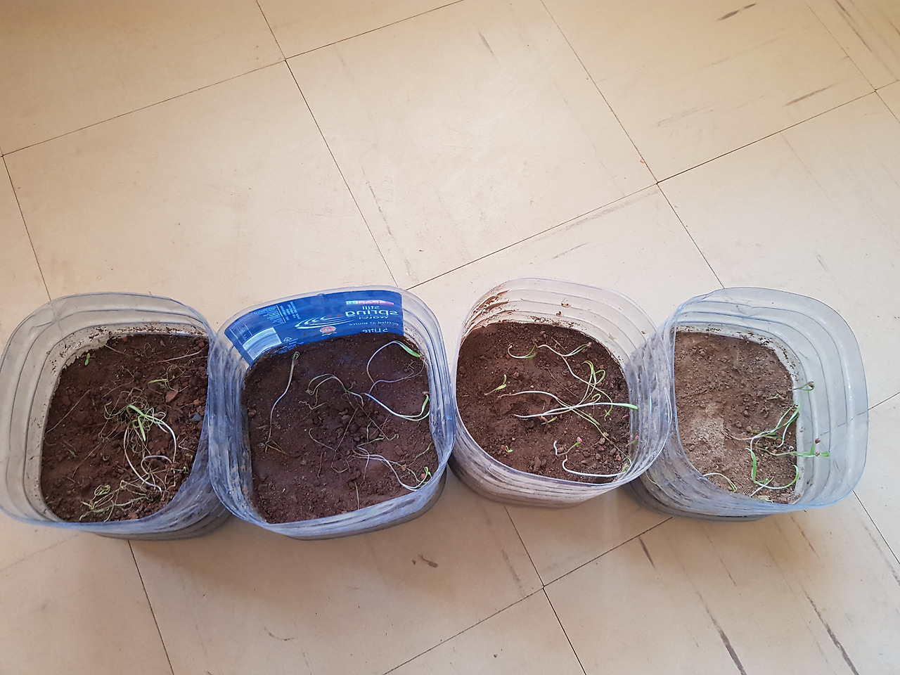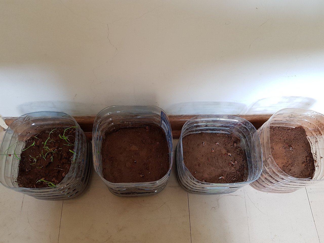 눈에 보이는 사방의 토양은 수분이 완벽하게 0%인 듯한 모래뿐이라 애초에 식물이 자랄 수 없는 조건이다. 그렇다고 어디서 거름흙을 파는 것도 아니라 나는 어떻게든 이 모래가 물기를 머금게 해야 했다. 나는 가장 먼저,화분으로 쓸 5L 생수통 네 개의 윗부분을 잘라냈다. 그리고 각 통의 절반을 먼지 펄펄 나는 모래로 채운 후, 물을 가득 부어 놓았다. 다음날, 고여 있던 물이 모래 속으로 흡수되자 나는 손가락으로 홈을 파고 그 안에 씨를 심었다. 처음엔 씨앗을 한 구멍에 두 개씩 넣다가 씨앗이 많이 남길래 나중엔 막 흩어 뿌렸다. 다 죽고 이 중에 반의 반만 살아도 성공이라 생각했다. 4일이 지나니 한 화분에서만 싹이 나오기 시작했다. 지난밤에 싹이 살짝 보이는 것 같더니 하룻밤 새 정말 신기하게 쑤욱 길어졌다. 나머지 세 통은 감감무소식이다. 또 3일 뒤, 우열한 한 통의 싹들은 쑥쑥 크고 있고, 나머지 통들에서 드디어 싹이 보이기 시작했다. 똑같은 조건에서 키우고 있는데 왜 한 통만 빨리 잘 자라는 걸까. 신경이 쓰이지만 나는 그냥 물이나 주며 계속 기다려 보기로 했다. 땅을 뚫고 나오는 게 어찌 쉬운 일이겠는가. 그렇게 일주일이 또 지나도록 씨앗들은 각기 다른 속도로 계속 자라났다.