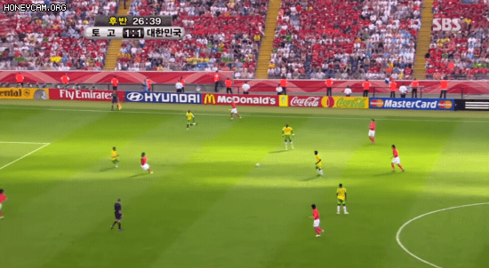 (정말 놀라운 사실 하나 더: 박지성은 거기서 멈추지 않고 센터백과 센터백 사이로 침투한다. 안정환 또는 조재진이 박지성에게 패스를 했을 때 가장 위협적으로 받아낼 수 있는 곳이다. 동시에 안정환의 슈팅이 골키퍼에게 막혔을 때 세컨드 볼을 가장 확실하게 받아낼 수 있는 위치이기도 하다)
