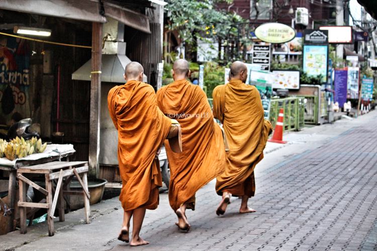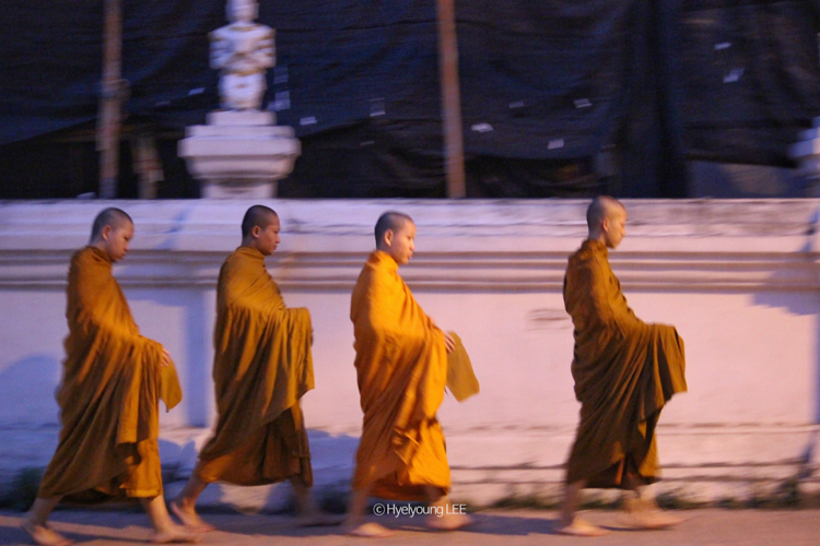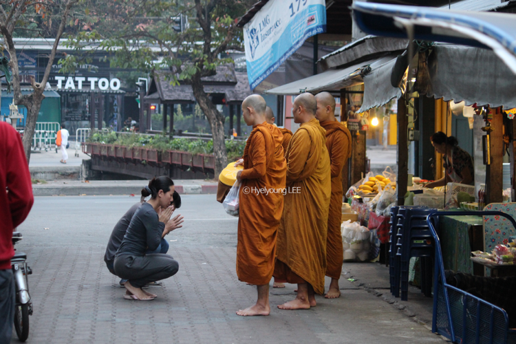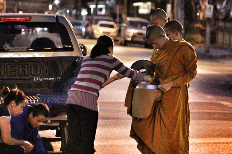 공경의 마음을 담아 음식을 시주하는 사람들과 맨발로 도시의 곳곳을 돌아다니며 조용히 축복으로 아침을 깨우는 승려들.