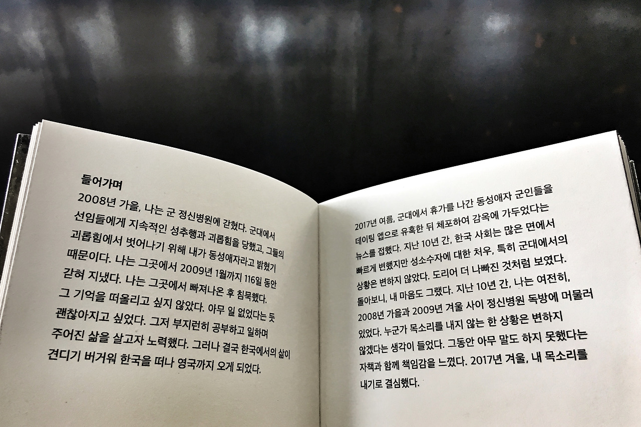 저자가 10년 전 군 복구 중 동성애자라는 이유로 군 정신병원에 갇혔던 개인의 경험을 편지 형식으로 표현한 작업을 진행했었고 그 기록을 책으로 엮었다.