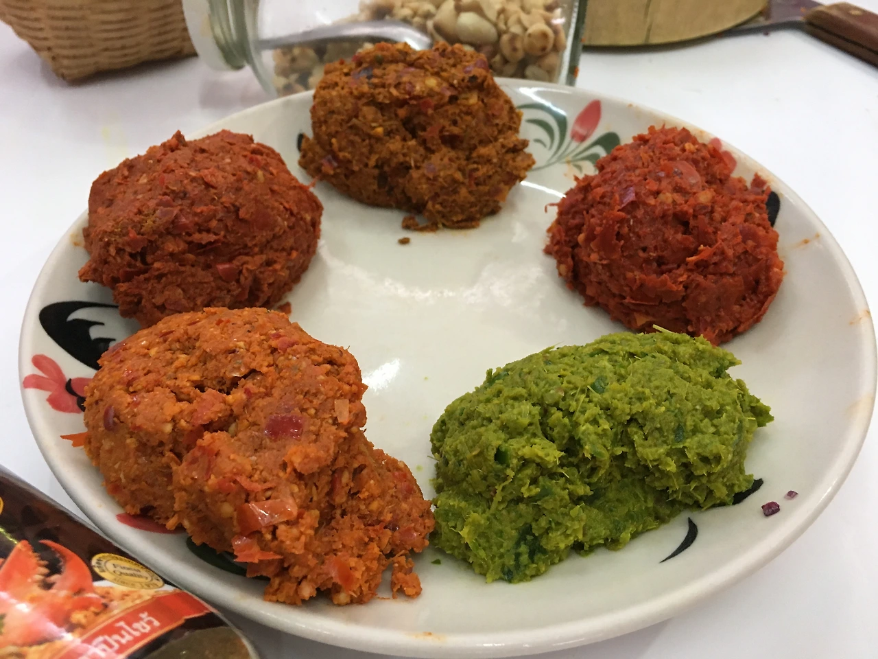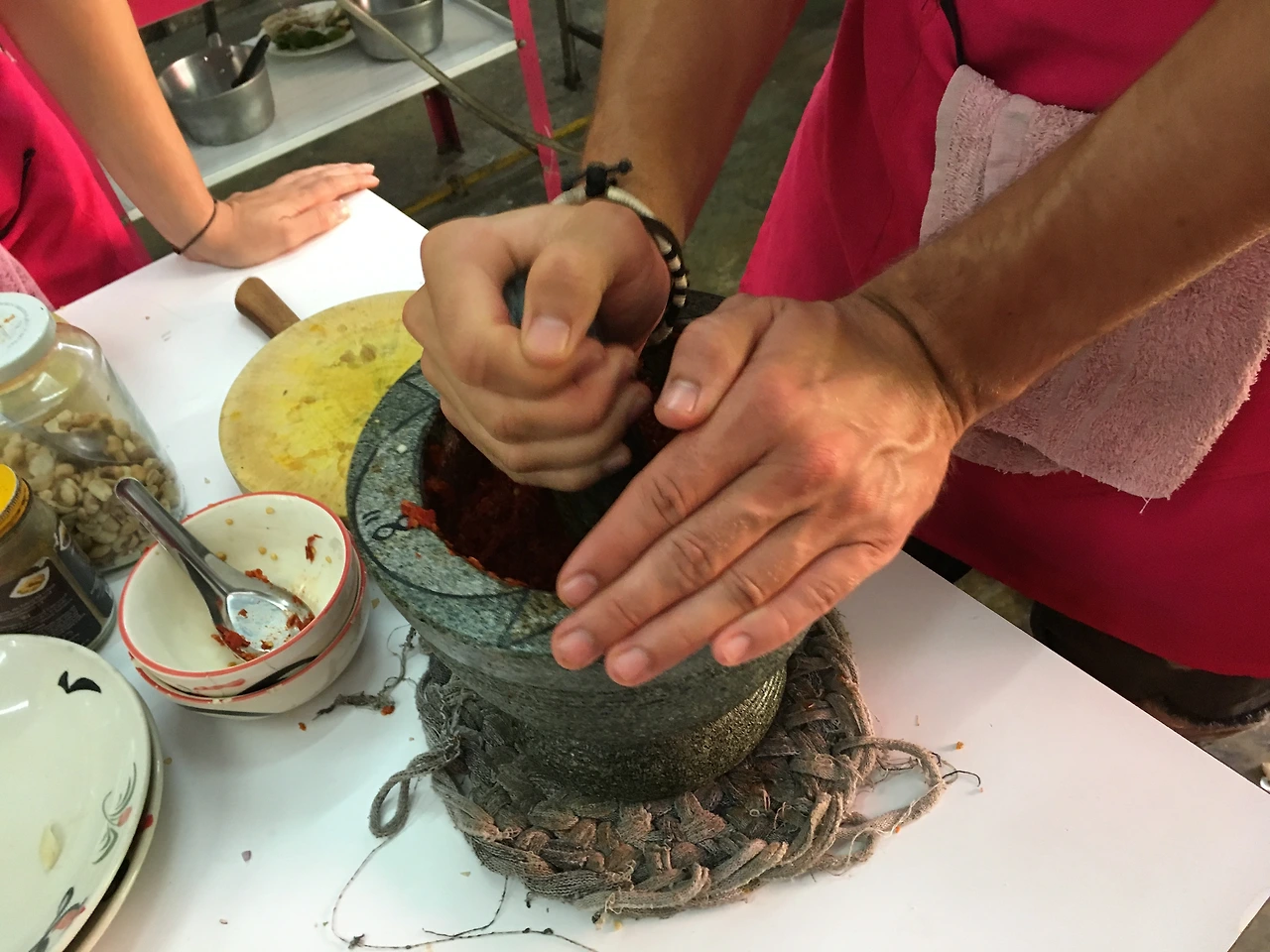 요리 과정이 특별히 어렵지는 않았지만 가장 정성이 들어간 음식을 꼽자면 커리 페이스트를 만드는 것이었다. 시중에 완성된 커리 페이스트가 팔기도 하지만, 오늘은 태국의 요리를 좀 더 이해하기 위해 직접 고추와 각종 향신료를 직접 썰고 빻아서 페이스트를 만든다. 한 20분은 빻아야 고추 껍질이 없어진 곱디 고운 페이스트가 완성된다. 이때는 내가 어떤 요리를 선택했는지가 중요하지 않다. 칼질이 서툰 사람이 있으면 도와주고 여기저기 절구질도 돌아가며 손을 보탠다.