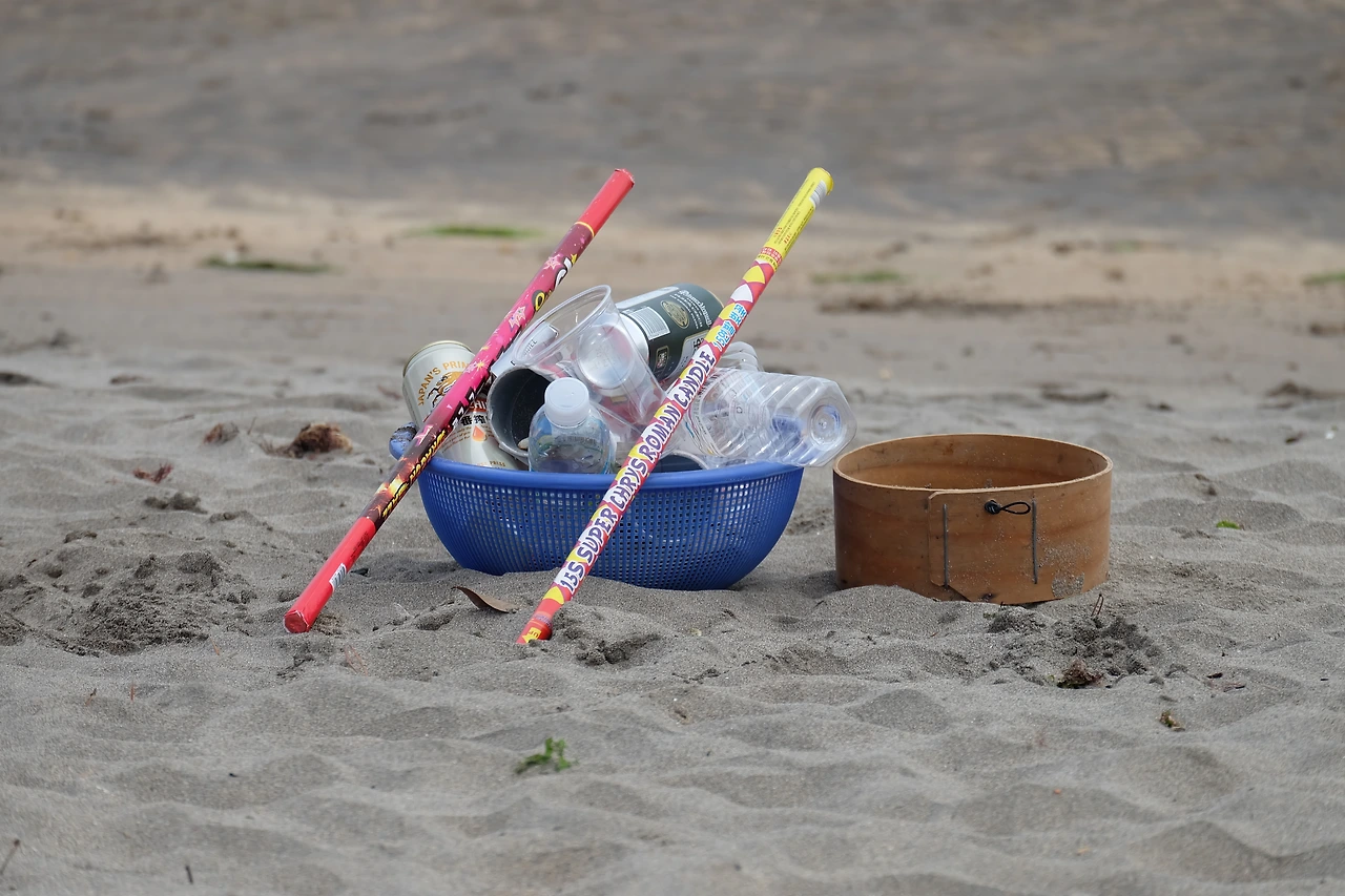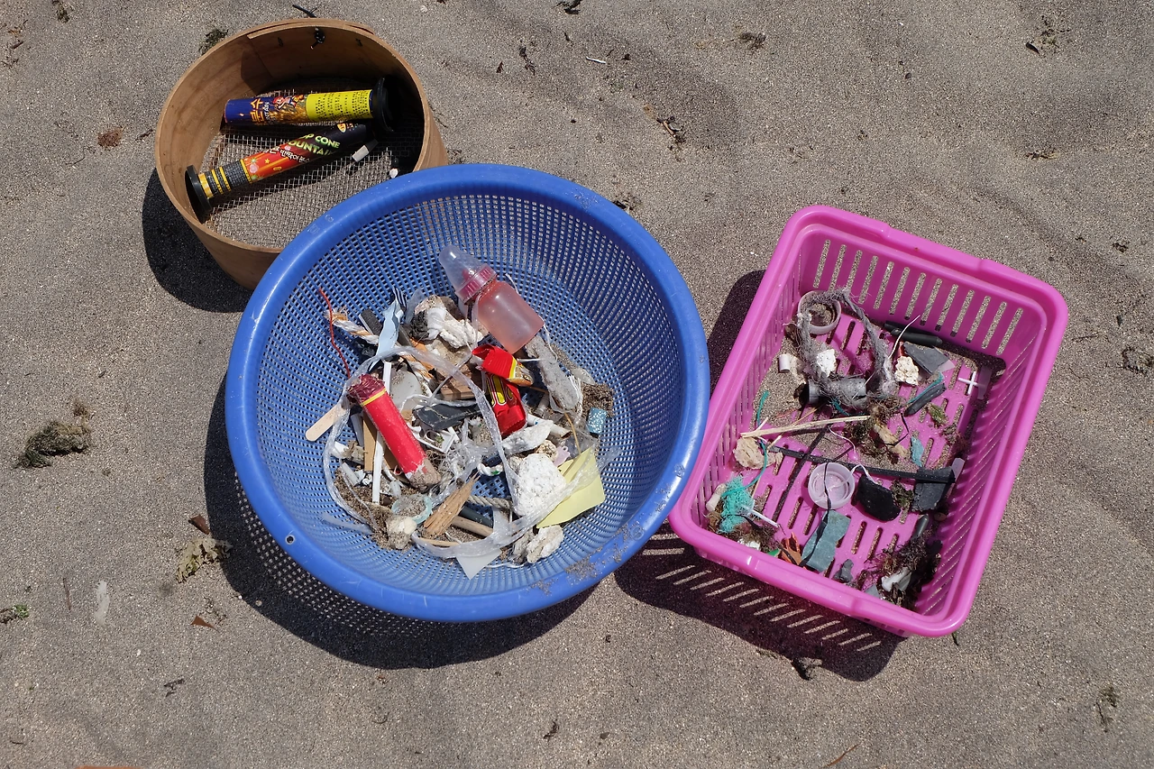 "모래 위를 자세히 살피면 알록달록한 작은 플라스틱이 가득 차있어요.