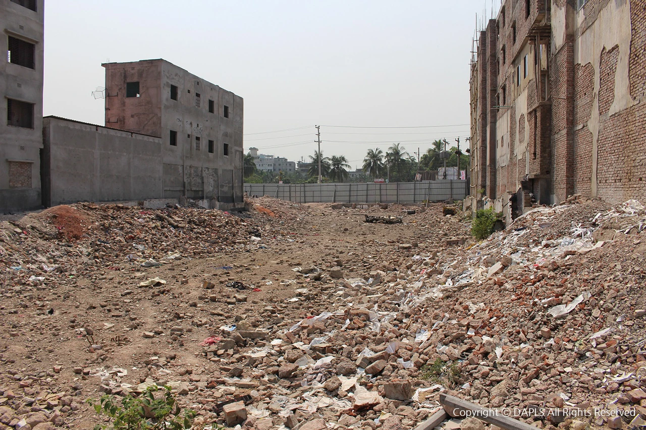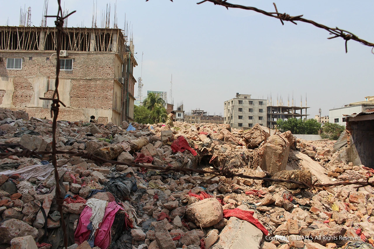붕괴된 건물의 잔해물은 원래 건물이 있던 장소의 뒤편 공터로 옮겨졌다. 현장에서 만난 경찰은 익숙한 듯 마치 가이드처럼 이곳저곳을 둘러볼 수 있도록 안내해줬다. 그리고 사실상 이곳에서의 모든 조사는 종료되었다고 말했다. 우리가 몇 가지 질문을 더 던졌지만, 그는 자신이 이리로 파견된 지 얼마 되지 않았다는 말로 대답을 대신했다. 붕괴의 잔해물이 바로 옆으로만 옮겨졌을 뿐, 아무것도 변한 게 없어 보였다. 건물 잔해와 뒤엉킨 옷가지와 의류 원단, 작업하던 사람들의 물건으로 보이는 줄자 등 아직도 현장은 수습되지 못하고 방치되어 있었다.