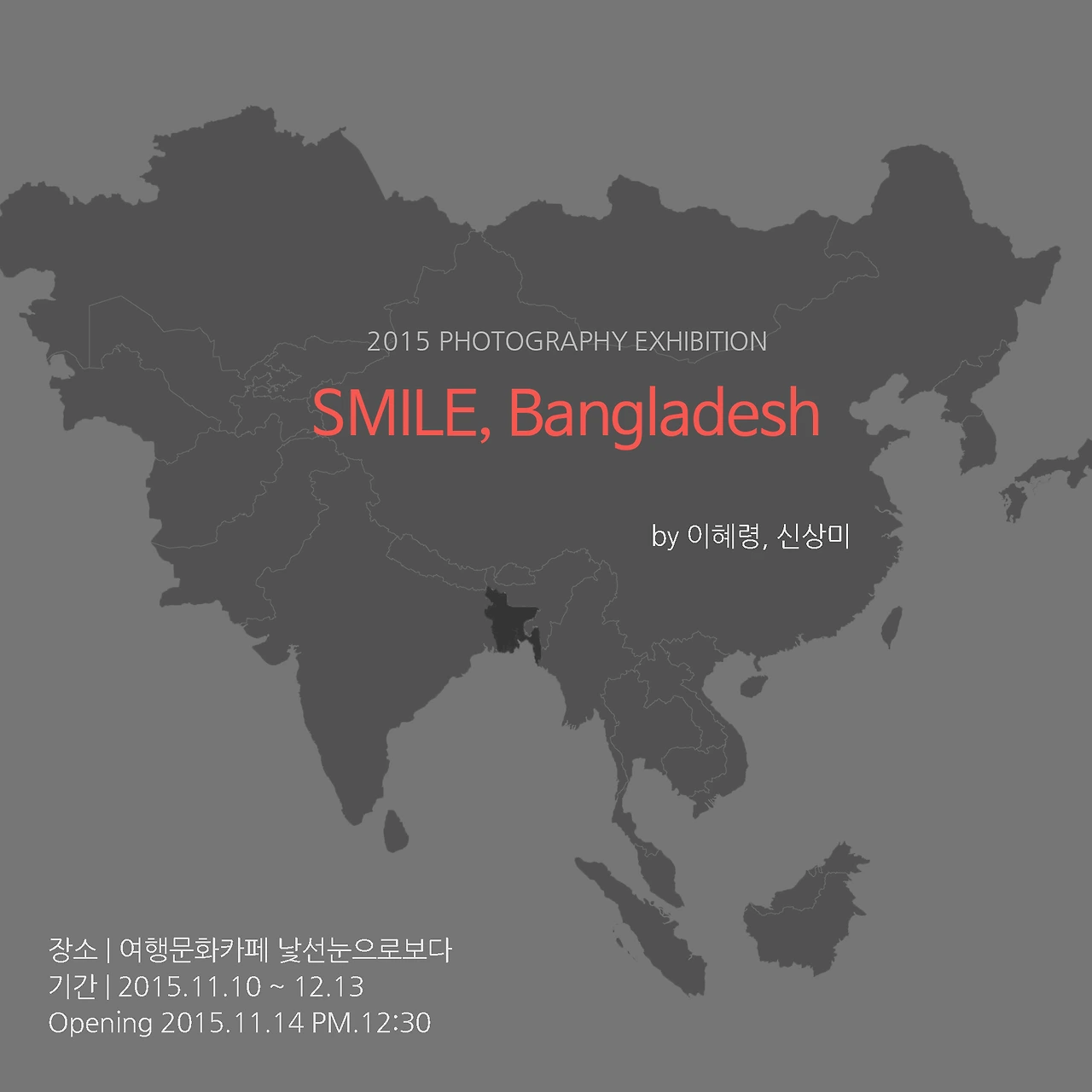 <Smile, 방글라데시> 사진전에서는 방글라데시 현지에서 진행했던 프로젝트 활동사진과 더불어 방글라데시 일상 속에서 만나는 평범한 삶의 모습, 우리가 만났던 가슴 따뜻한 사람을 소개하려 합니다.