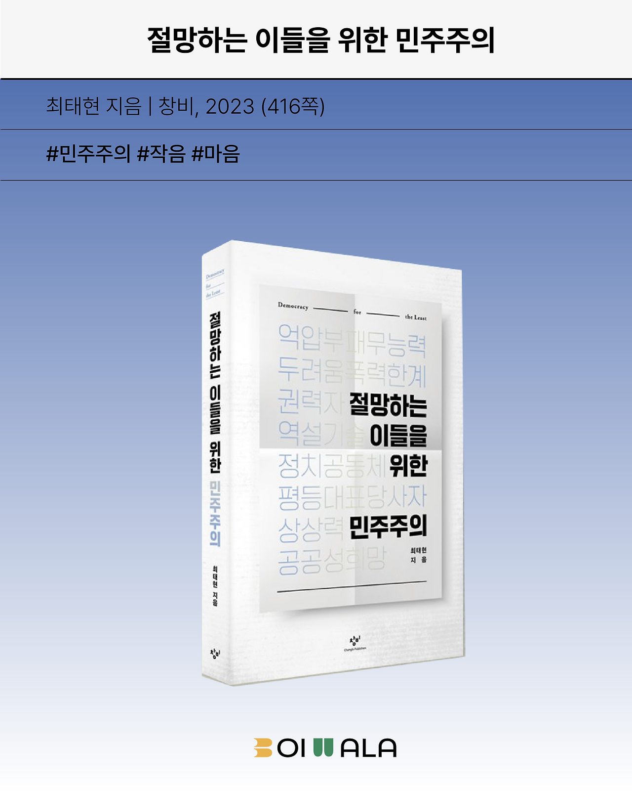 최태현의 『절망하는 이들을 위한 민주주의』는 현대 민주주의가 직면한 역설과 한계를 분석하며 그 속에서도 실천 가능한 희망의 실마리를 탐구한다. 저자는 대의제 민주주의, 정부의 역할, 조직 내 권력, 리더십 등 민주주의의 역설과 한계를 직시하며, 이를 넘어 새로운 가능성을 모색하는 깊이 있는 분석을 제공한다. 특히, 민주주의의 근본을 ‘마음’에서 찾고, “작은 자들”과 “작은 공”이라는 개념을 통해 새로운 공공성을 탐구한다. 저자는 민주주의의 딜레마를 분석하며, 그 해법이 단순히 제도의 개선에 있지 않고, 시민의 윤리적 기반과 마음의 재정립에 있음을 주장한다.