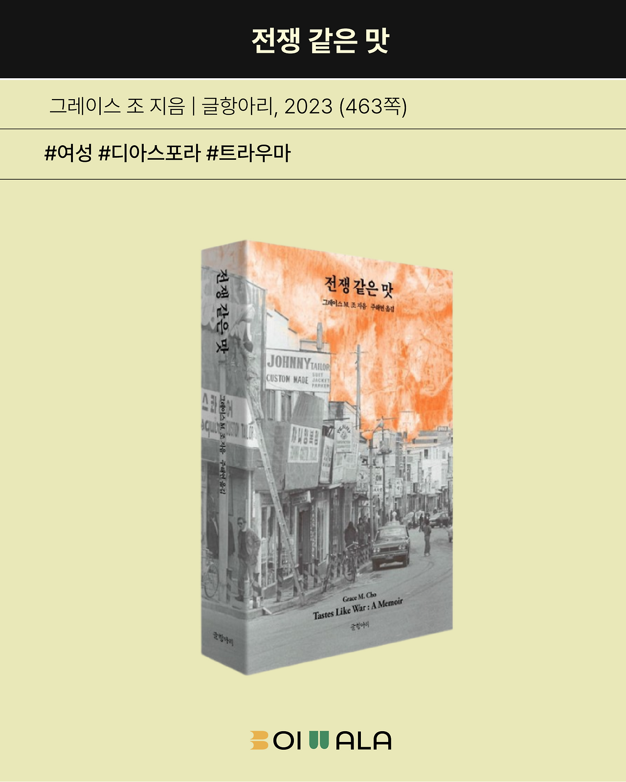 『전쟁 같은 맛』에는 두 여성이 등장한다. 첫 번째 여성은 군자다. 그녀는 1941년 식민지 조선에서 태어나 일제강점기와 한국전쟁을 겪었으며, 기지촌에서 일하다 아이들을 위해 미국으로 이주했다. 또 다른 여성은 이 책의 저자인 그레이스 M. 조이다. 한국계 미국인으로, 2세대 디아스포라 사회학자이자 군자의 딸이다. 그는 ‘군자’로 대표되는 전후 한인 이주여성의 삶과 궤적 속에 얽힌 사회적 폭력을 연구해 왔다. 어머니의 죽음 이후, 그녀는 군자의 생애를 새롭게 복기하기 시작하며, 『전쟁 같은 맛』을 집필했다.