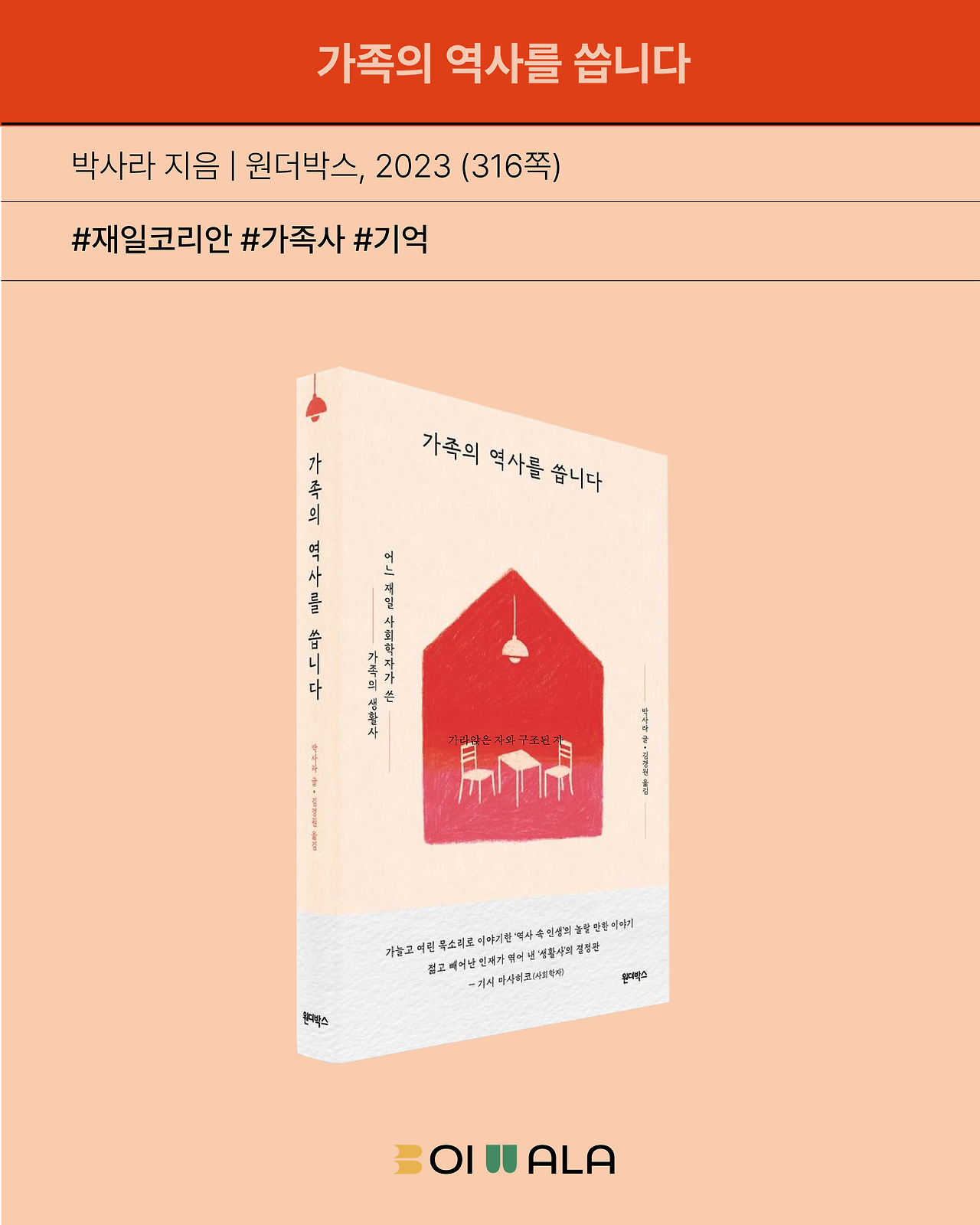 『가족의 역사를 씁니다』는 재일코리안 3세 사회학자 박사라가 제주도를 떠나 일본에서 삶의 터전을 일군 네 명의 친척들의 생애를 기록한 가족사다. 저자는 자신의 둘째 고모부, 둘째 고모, 셋째 큰아버지, 넷째 고모의 삶을 따라가며 4·3 사건과 일본으로의 이주와 정착 과정에서 겪은 개인적 체험을 통해 재일코리안의 역사를 조명한다. 이 과정에서 구술이 지닌 힘과 한계를 동시에 드러내며, 개인의 경험이 어떻게 역사로 자리 잡을 수 있는지를 고민한다. ‘가족의 역사’는 단순한 개인의 삶의 기록이 아니라, 역사의 공백을 채우고 국가 중심의 서사에서 배제된 사람들의 삶을 복원하는 작업이다. 이 책은 바로 그 지점에서 출발한다.