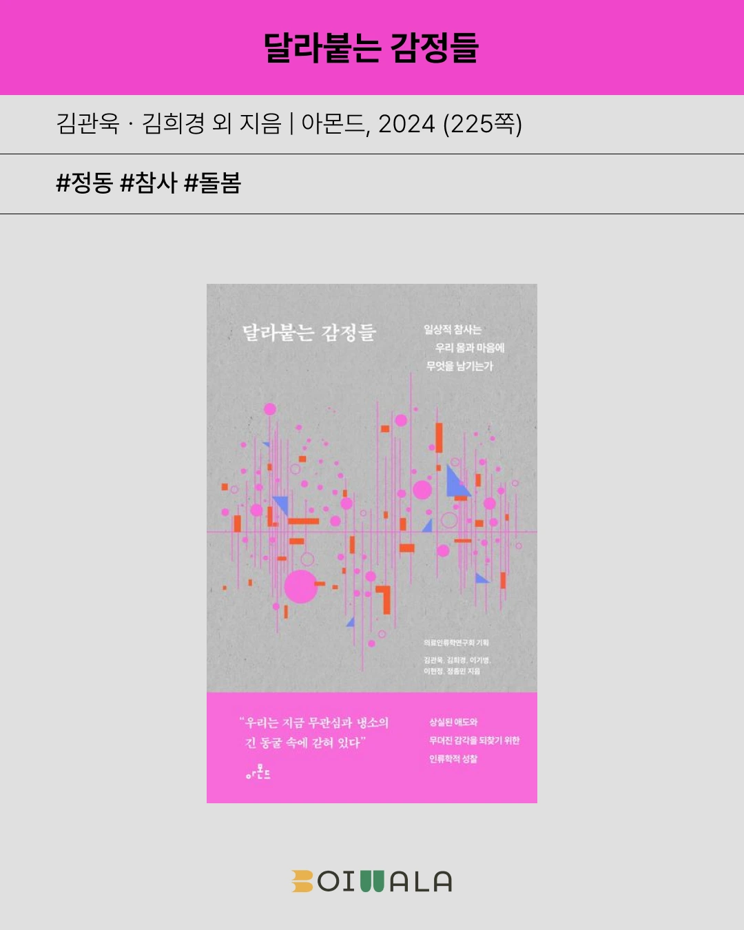 『달라붙는 감정들』은 참사와 돌봄, 애도와 무관심이라는 정동의 계보를 추적하며, 이를 통해 한국 사회의 현재를 비판적으로 성찰한다. 이 책은 단순히 과거의 비극을 복기하는 데 그치지 않고, 미래를 위한 새로운 방향과 실천을 모색하며 정동 이론을 통해 우리가 다시금 연대하고 변화할 수 있는 가능성을 모색한다. 책이 제기하는 질문은 명확하다. “내 앞에 고통받는 존재가 있다. 나는 무엇을 할 것인가?” 우리는 이 질문에 응답할 준비가 되어 있는가?