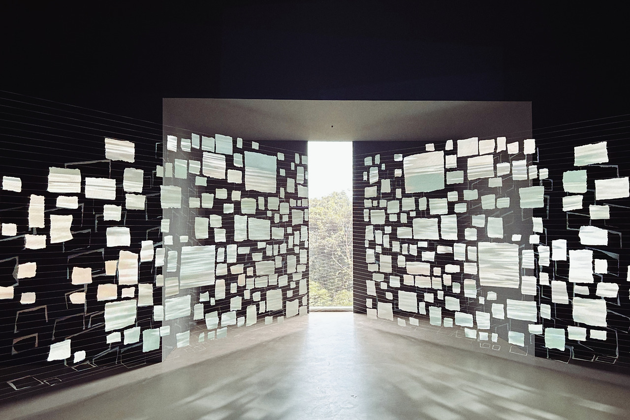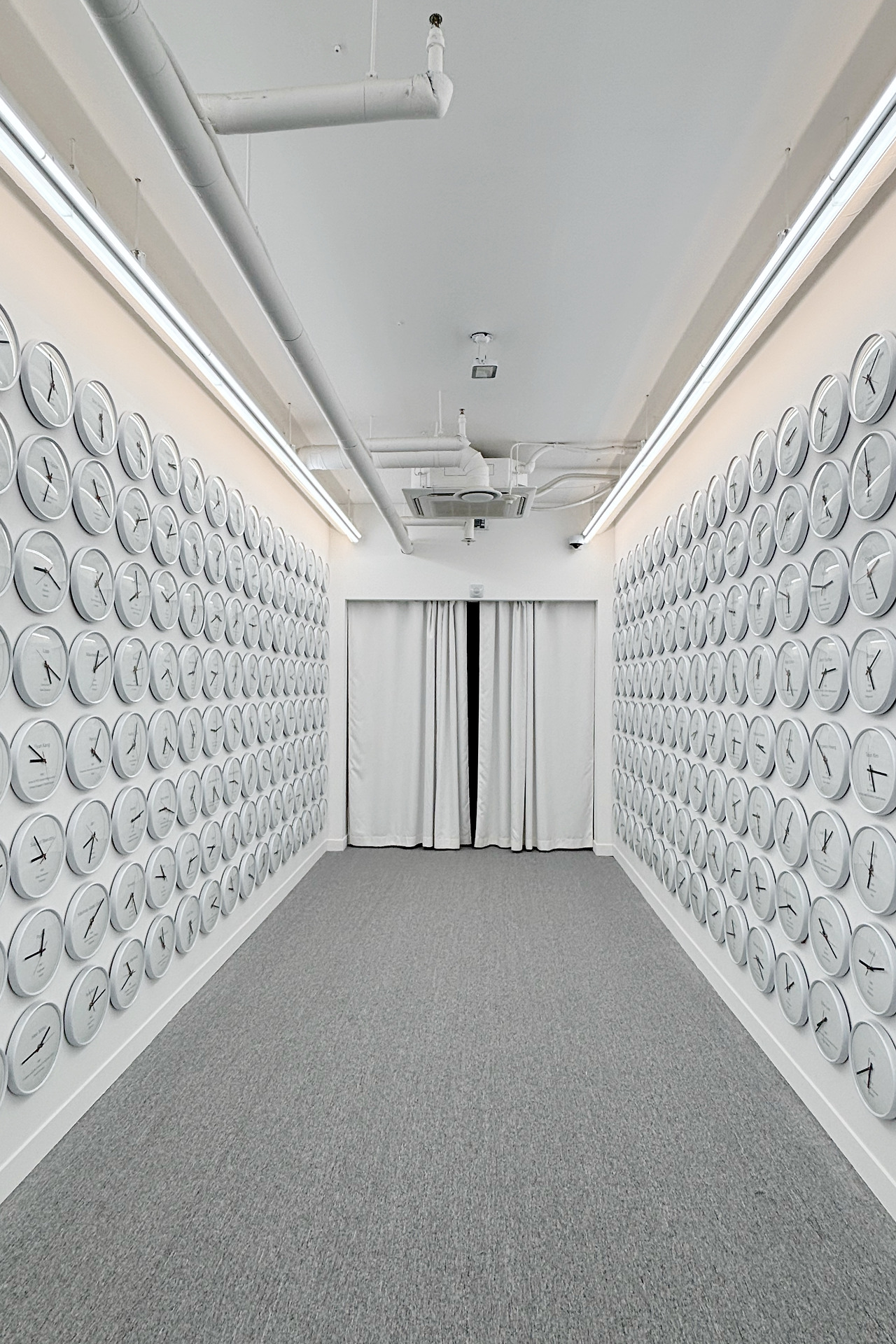 제2전시실의 전시에서는 시간의 상대성과 감각적 경험을 조형 언어로 변주하며, 시간의 본질을 탐구한다. 수미 카나자와가 신문지 위에 10B 연필로 무수히 그어낸 선들의 광택으로 구현한 우주 은하수, 매 분마다 새로운 시곗바늘을 만드는 반복 노동으로 현대인의 시간 감각을 문제화하는 마르텐 바스의 <리얼 타임 컨베이어 벨트 클락>, 실 위에 고정된 종이 스크린 위에 여러 프로젝터에서 투사하여 꿈 속 같은 공간을 가시화한 사라 제의 <Sleepers>, 각자의 상황에 따라 다르게 체감되는 개인의 시간 경험을 시계 속도로 번역한 이완의 <고유시> 등은 다양한 매체를 통해 시간이라는 추상적 개념을 구체적 조형 언어로 변환한 전시 구현 방식이 인상적이었다.