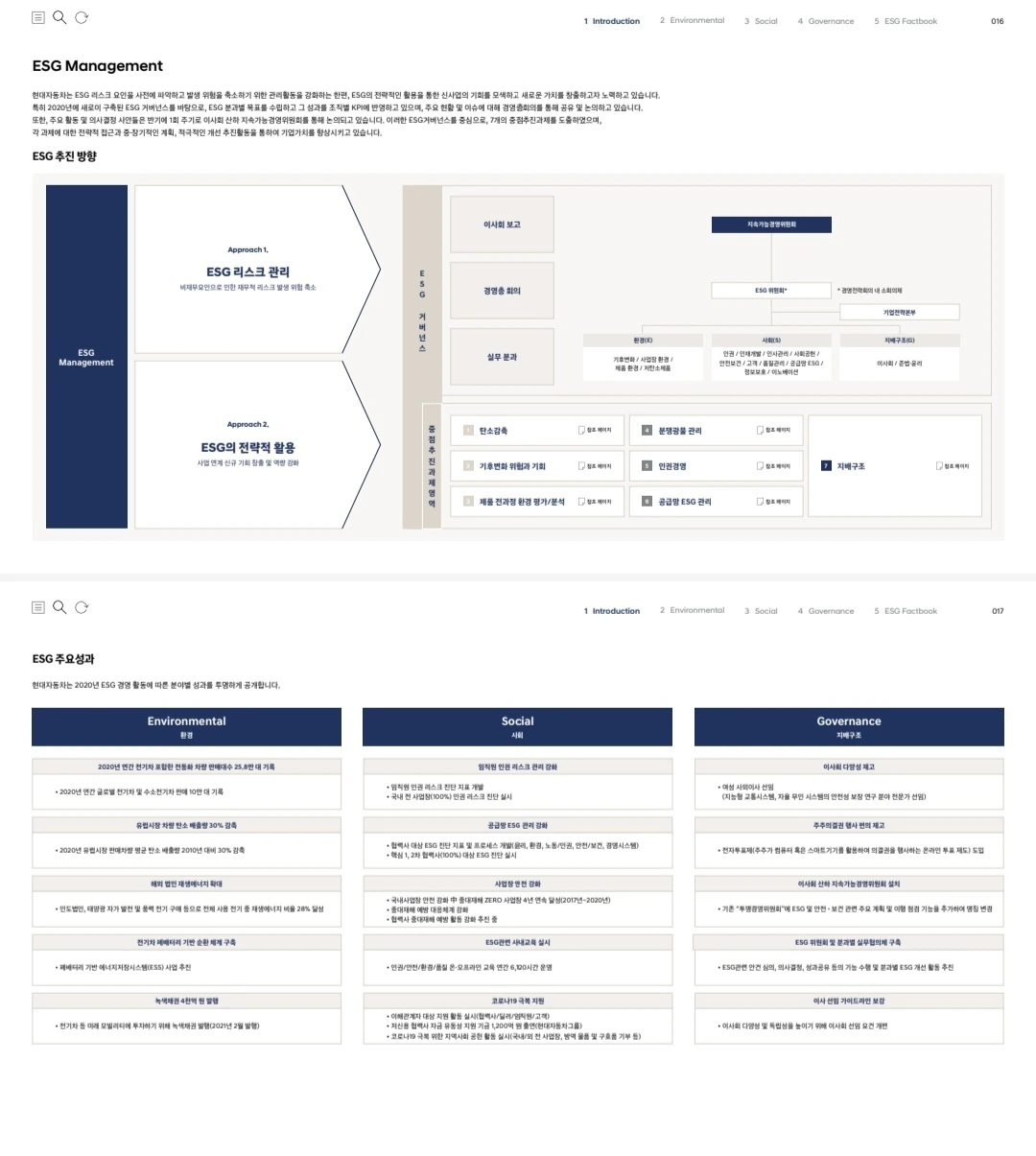 이 보고서를 통해 제품을 생산하고 서비스를 제공하는 것에 그치지 않고 제품을 생산하는 과정, 임직원의 근로 문화와 공장과 지역사회 환경, 고객의 경험과 더 나아가 국가 간의 정치적 이슈까지 모든 것을 고려해 하나의 제품이 생산되고 고객이 사용하는 일련의 과정에 있어 그 어떤 것도 지속 불가능한 상황이 발생되지 않도록 안정적으로 관리하는 현대자동차의 노력과 성과에 대해 투자자 및 이해관계자들에게 상세히 설명하고 있는데요.