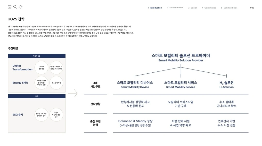 지속가능성 보고서를 보면, 현대자동차는 전기차, 자율주행, 커넥티드 카 서비스, 로봇, 스마트 팩토리, 모빌리티, 수소 등 자동차를 생산하는 것부터 운행, 카 라이프, 자동차에 필요한 에너지, 플랫폼까지 차와 일상에 관련된 모든 제품과 서비스, 문화, 환경까지 개발에 투자를 아끼지 않고 있어요.