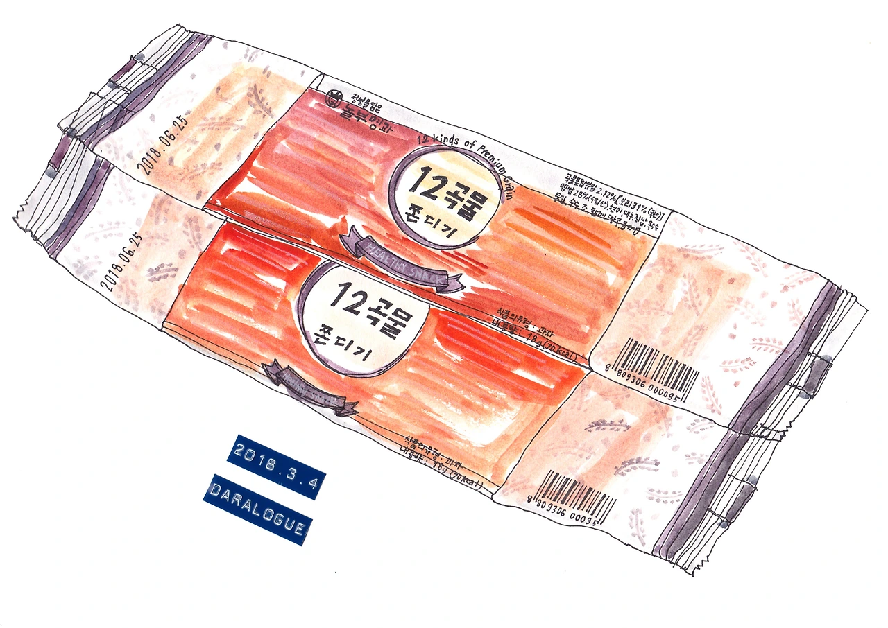 엄마가 일용할 양식을 보내주시면서 '12곡물 쫀디기' 한 봉지도 같이 보내주셨다. 포장지를 보고 피식했다. '불량식품 쫀디기, 마이 컸다' 하는 마음이었다. 뭘로 만든지도 모른 채 탄맛과 쫀득한 식감 때문에 먹던 쫀디기(쫀드기라고 불렀던 것 같은데)가 '12곡물 쫀디기'가 되어 'healthy snack'이라는 리본을 당당히 달고 나오는 시대가 오다니! 이런 거 귀찮아서 잘 안 먹는데, 요즘 간식거리가 없어서 하나 구워 먹어 봤더니 꽤 맛있다. 아니 너무 맛있다. 가스레인지 앞을 몇 번이나 왔다 갔다 했는지. 브랜드 네임에, 개별포장에 끕(급이라고 쓰기엔 뭔가 아쉽다)이 달라진 쫀디기, 중독성은 여전하네 하며 또 하나 구우러 간다.
