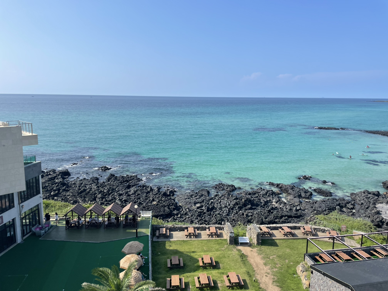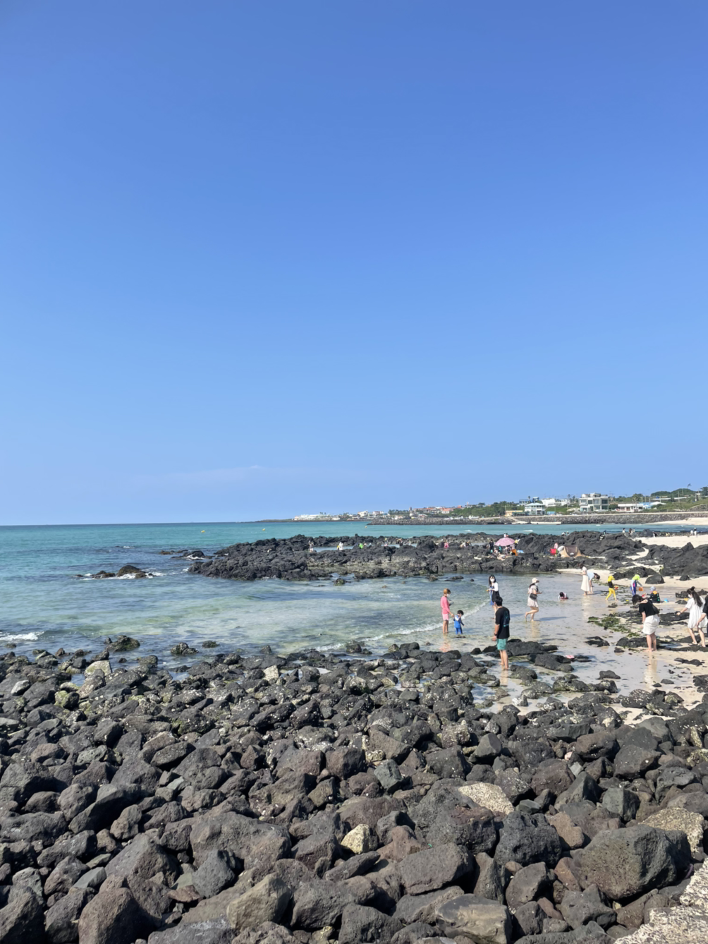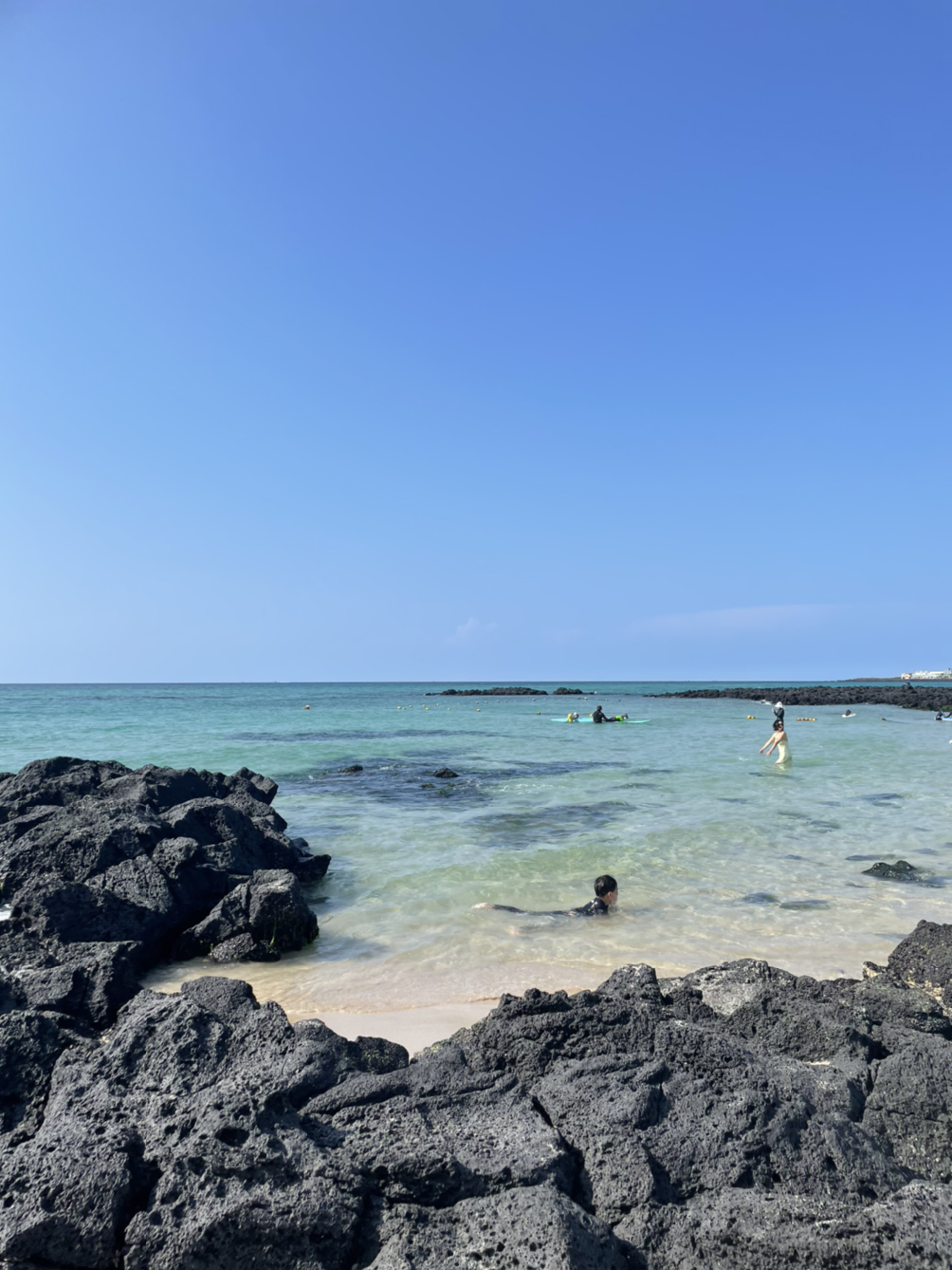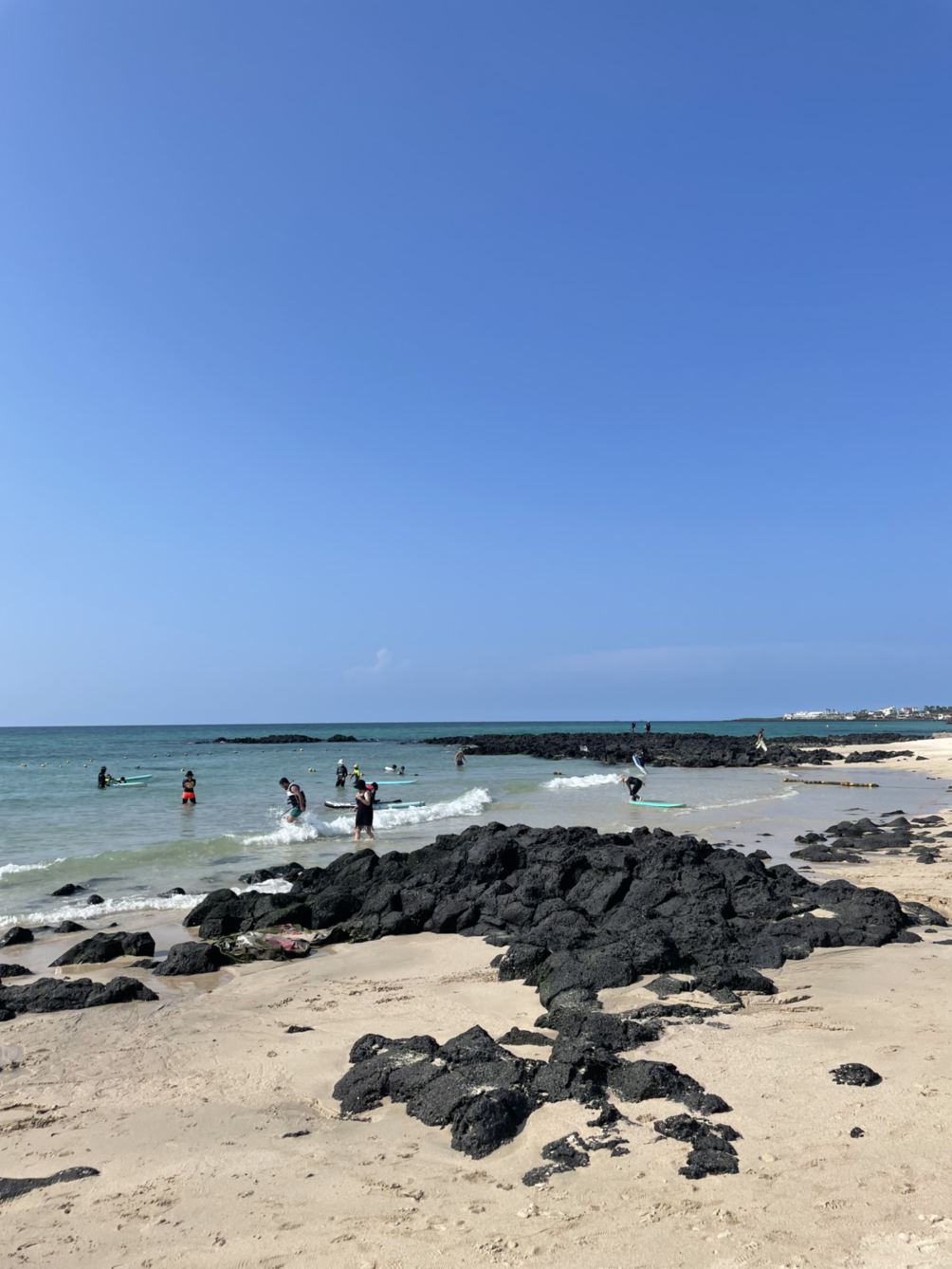 늦여름이었지만 아직 해변을 즐기는 사람이 있었다. 여유롭고 평화로워 보이는 풍경이다. 햇빛이 쨍쨍이라 덥고 뜨겁긴 했지만 바다에 왔으니까! 사진도 마음껏 찍고, 잠깐 앉아 에메랄드빛 제주 바다도 넋 놓고 바라보았다.