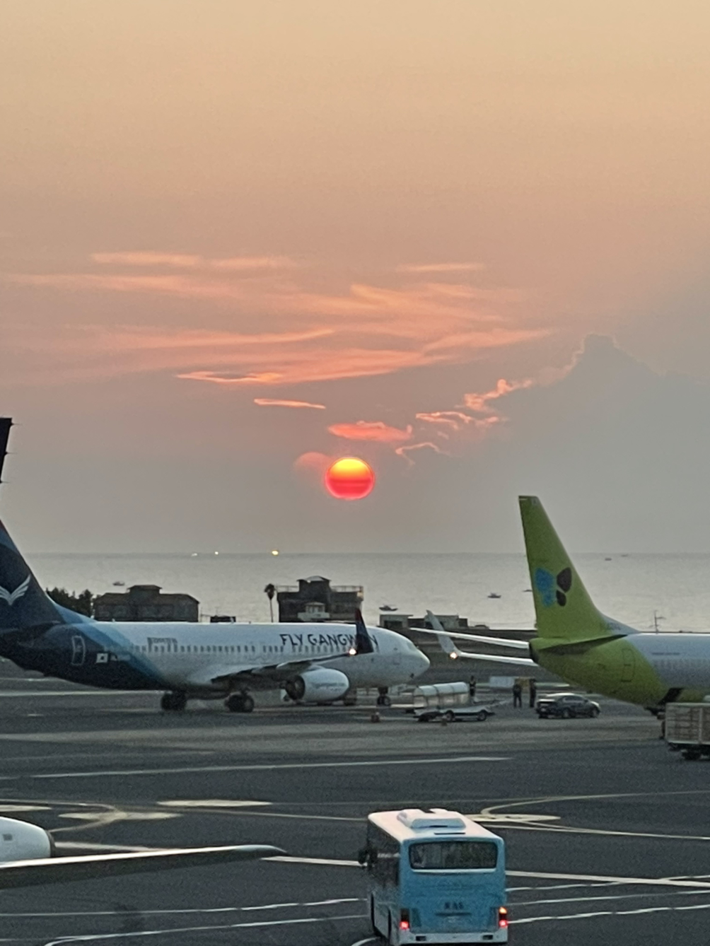 그리고 다시 떠나야 하는 시간. 하루 만에 오가는 일정이 참 빡빡하고 아쉽다. 긴 하루를 보내고 다시 돌아가는 길. 늦지 않게 공항에 도착을 하니 해는 뉘엿뉘엿 지고 있고, 노을은 붉게 물들어가고 있다.