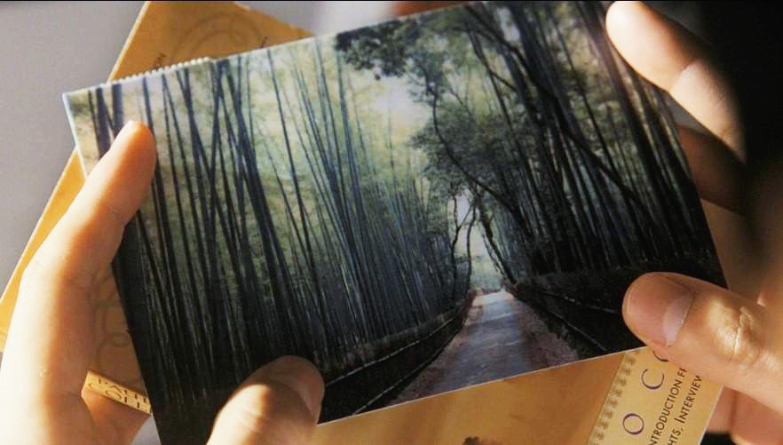 말쑥한 차림의 남자의 손에는 아름다운 대나무 숲의 사진과 그가 읽던 소설책이 들려 있습니다.
