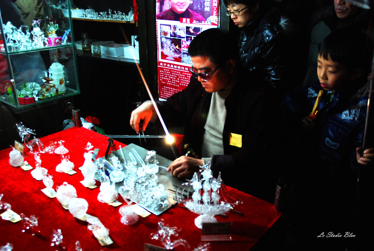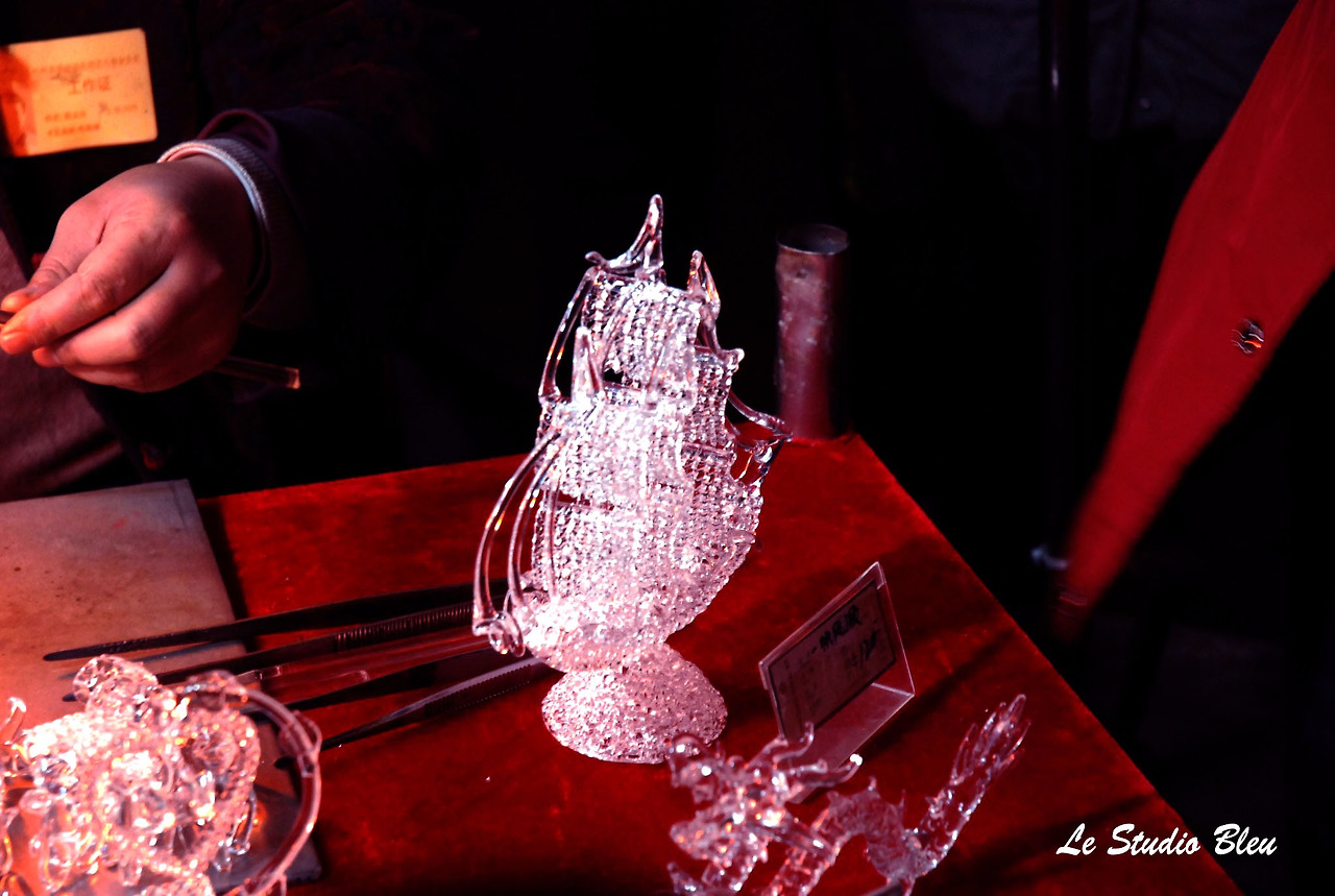 유리 공예하는 장인의 시범이 한창이다.