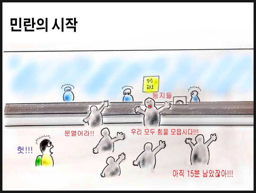 밖의 심상찮은 상황을 바라보고 있던 매표소 사람들이 술렁인다. 매표소 안의 누님이 마지못해 마이크에 대고이야기를 했다.