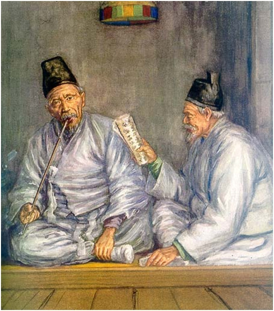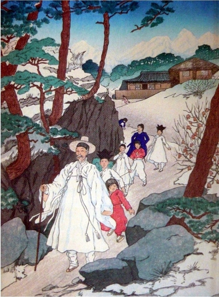 밝게 떠오르는 햇살 아래로 암갈색의 황소들이 짐을 실은 채로 걸어갑니다. 하얀 옷을 입고 허리를 펴고 곧게 걸어가는 키 큰 사람들.
