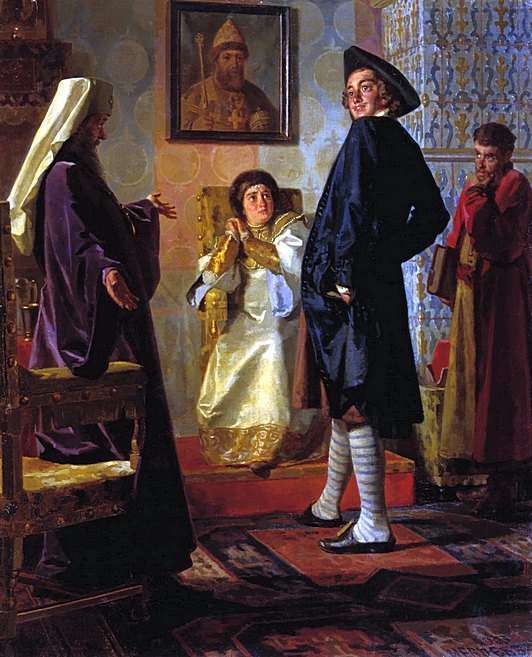 고집스럽게 전통을 고수하는 신하들이 입고 있는 러시아 전통옷들의 긴소매를 직접 잘라내고, <독일식 계량의복>을 입을 것을 명령합니다.