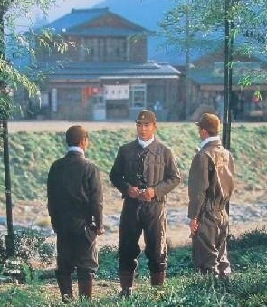 그의 분대원인 야마오카, 후지에다 가 지켜보는 가운데