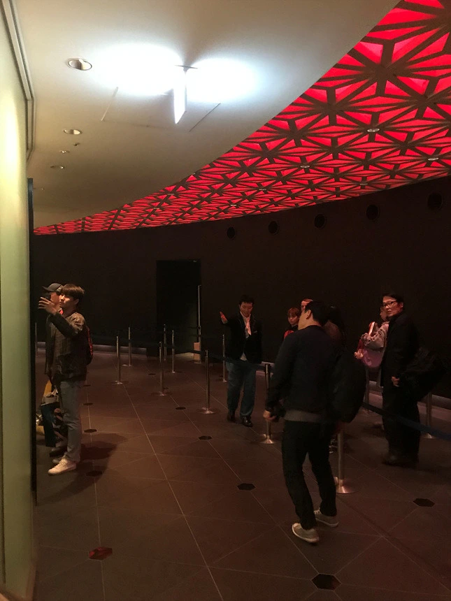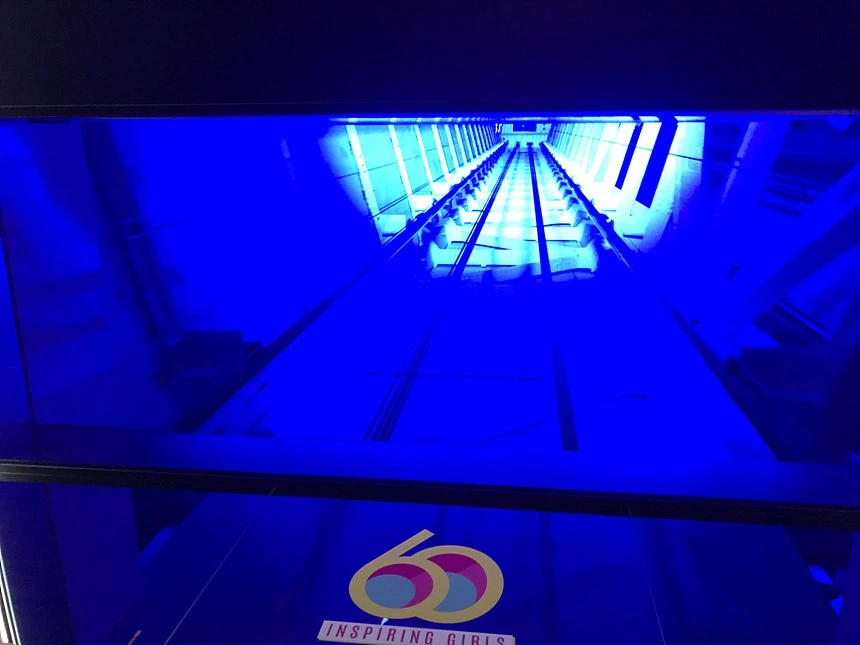 우선 인테리어를 한 것도, 안한 것도 아닌 볼거리 없는 어정쩡한 복도는 마치 설계나 시공을 하다 만 듯한 느낌이 풍길 정도로 황량했다. 엘리베이터는 40인승 규모에 속도는 분속 600m로 상당히 빠른 편이었다. 350m까지 30초 남짓 하면 올라가는 정도였으니 말이다. 하지만 막상 엘리베이터 안에서는 밖을 볼 수도 없고 그나마 상영해주는 영상도 구석 한편에 있는 작은 모니터가 전부였다. 하다못해 서울의 남산타워도 천장 전체를 영상으로 틀어주는 식인데 비해서 너무 신경을 안 쓴 모습이었다. 뭔가 멋진 풍경을 보기 전에 기대하게 만드는 감흥이 전혀 없달까. 그러다 보니 엘리베이터 한쪽을 차지한 정체를 알 수 없는 형형색색의 반짝거리는 LED 문양을 보고는 그러려니 할 정도였다. 정말 이 건물이 2012년에 지어진 게 맞는 것인지...