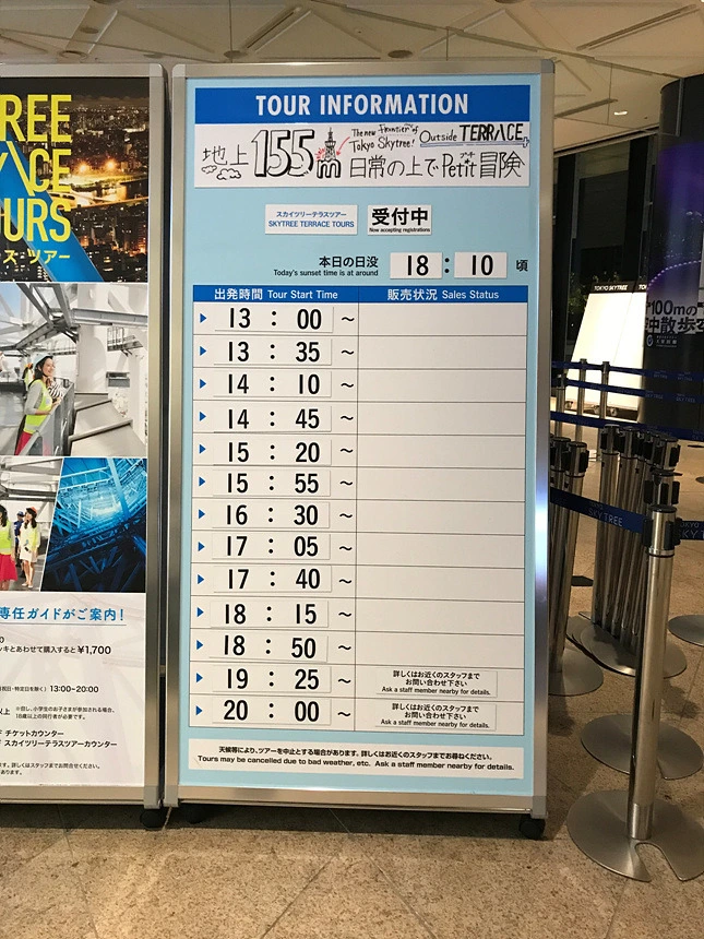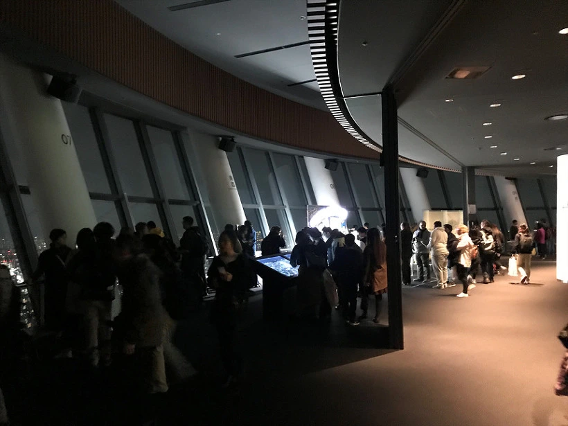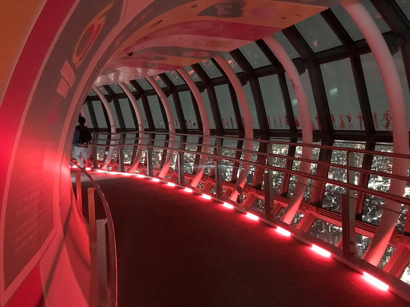 입장은 35분 단위로 이루어진다. 350m에 메인 전망대가 있고, 추가로 표를 끊거나 처음부터 콤보티켓을 사면 엘리베이터를 갈아타고 450m에 있는 텐보 갤러리와 전망대에 들어갈 수 있다. 전망대와는 별개로 100m 정도 높이에서 밖으로 나가 하부 구조물을 가까이에서 살펴보는 투어 프로그램도 운영하고 있는 것 같았으나 낮에만 운영하고 별도 예약이 필요한지라 해보지 못했다. 개인적으로 전망대보다 더 궁금한 프로그램이었기에 아쉬움이 조금 남는다.