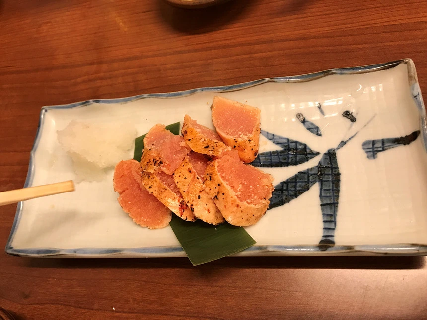 우리는 가까운 곳에 위치한 일본식 술집에 들어가서 저녁 겸 간단하게 생맥주로 목을 축이기로 했다 꽤 다양한 메뉴를 작게 여럿 시켜서 맛보았는데 정신없이 먹다 보니 사진을 못 찍었다. 그나마 딱 한 장 있는 게 저 명란 구이인데, 결혼하고 나서 아내와 함께 술을 마시다가 우연히 명란을 구워 먹을 수도 있다는 걸 알게 되었고 이후 즐겨 먹던 메뉴다. 일본에서 먹으면 더 맛있을까 해서 시켜봤는데 음, 내가 직접 구운 게 나은 것 같기도 하다. 시부야로 자리를 옮겨 미식회가 계속 이어졌다.