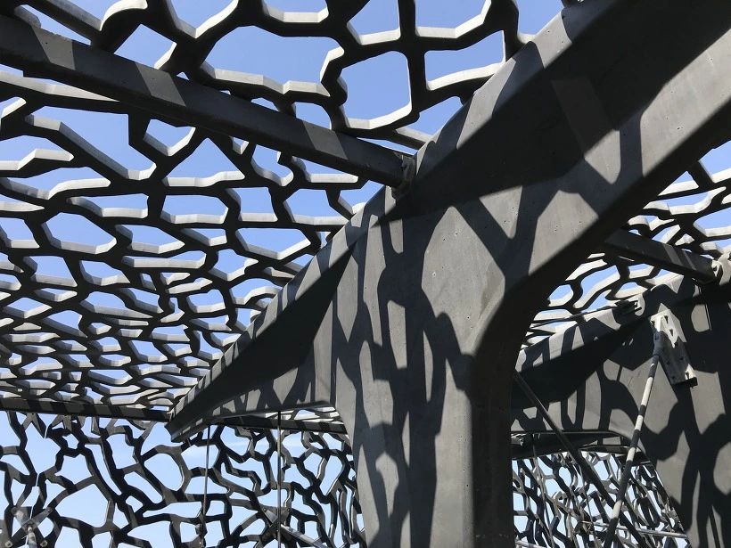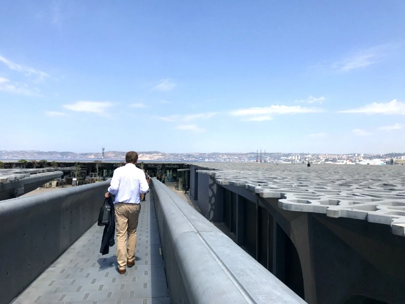 박물관은 마르세유 항구 초입의 거대하고 평평한 간척지 위에 지어졌다. 그 아래로는 거대한 주차장이 있었다. 편안하게 차를 세우고 밖으로 나오자 드넓은 푸른 바다와 새하얀 모래밭이 우릴 반겼다. 그 위로 툭 하고 무심하게 올려진 듯한 건물이 바로 '유럽 지중해 문명박물관'이었다. 세장한 다리와 대조를 이루는 거대한 크기의 무표정한 매스가 인상 깊었다.