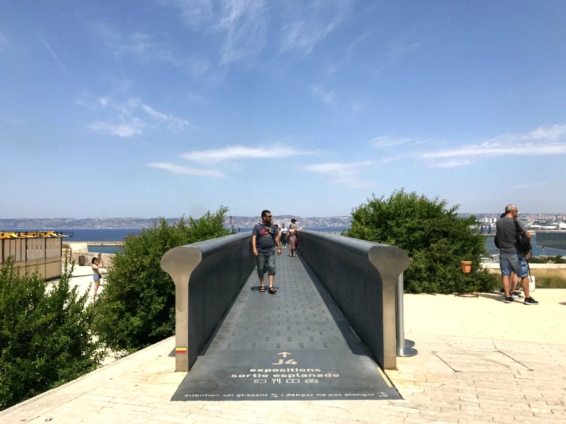 길이 130m, 폭 4m 남짓의 다리는 박물관의 옥상과 구도심의 '생장 요새(Fort St. Jean)'를 잇는 보행교다. 가느다란 비례의 조형미와 중간 기둥이 없는 구조미가 과연 사진으로 처음 보았던 것만큼이나 인상적이었다. 설레는 마음으로 다리를 건너기 시작했다.