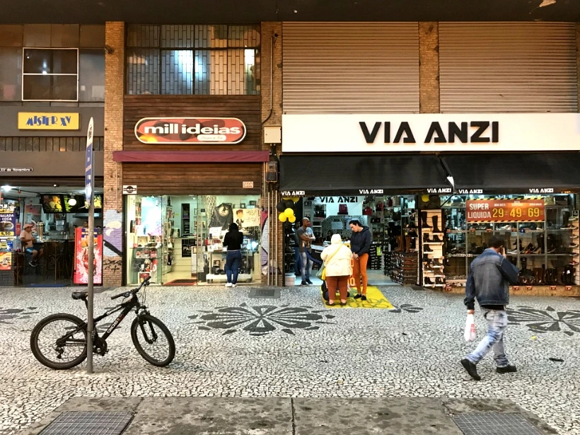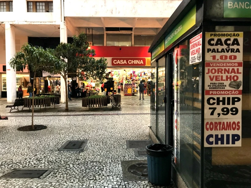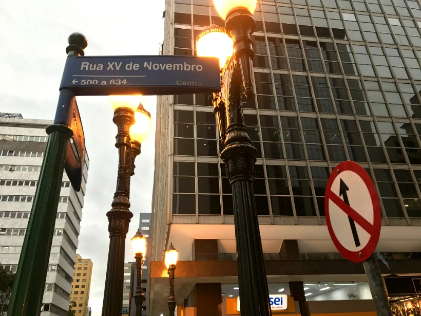 보행자 전용도로의 시작을 알리는 진입금지 표지판, '11월 15일 거리(Rua XV de Novembro)'는 '꽃의 거리'의 행정 지명이다.