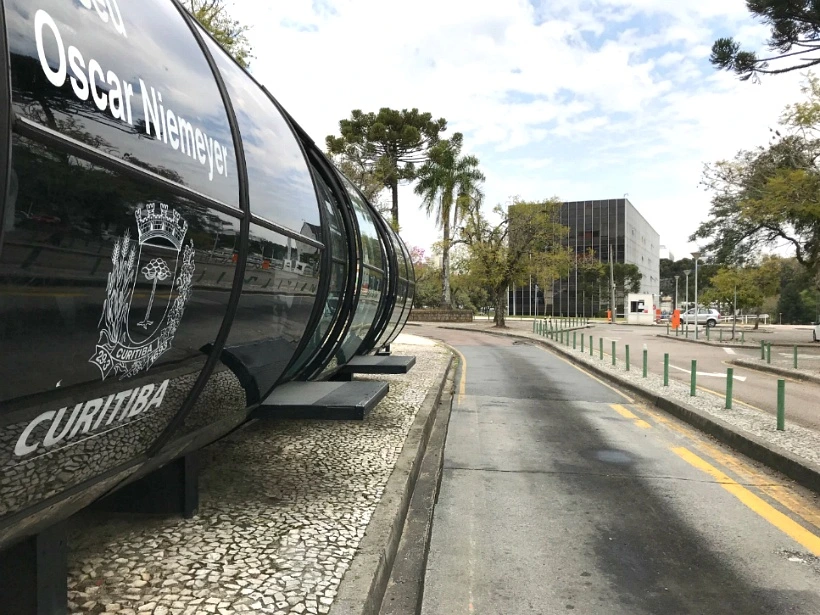 오스카 니마이어 뮤지엄 앞의 버스 정류장, 쿠리치바시의 표준인 '튜브(tube)' 형태로 되어 있다.