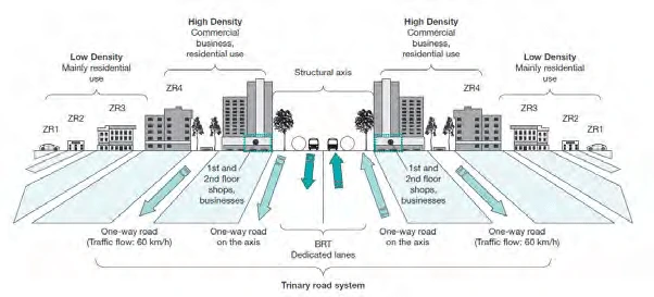 쿠리치바 도로체계를 한눈에 보여주는 단면도 (출처: UN-Habitat, 2013)