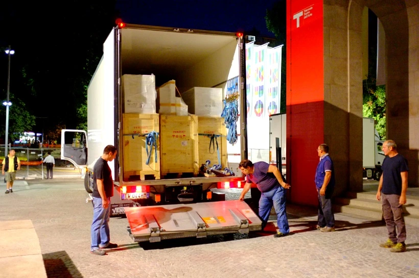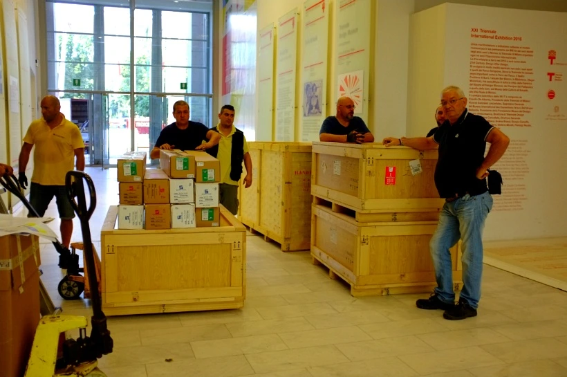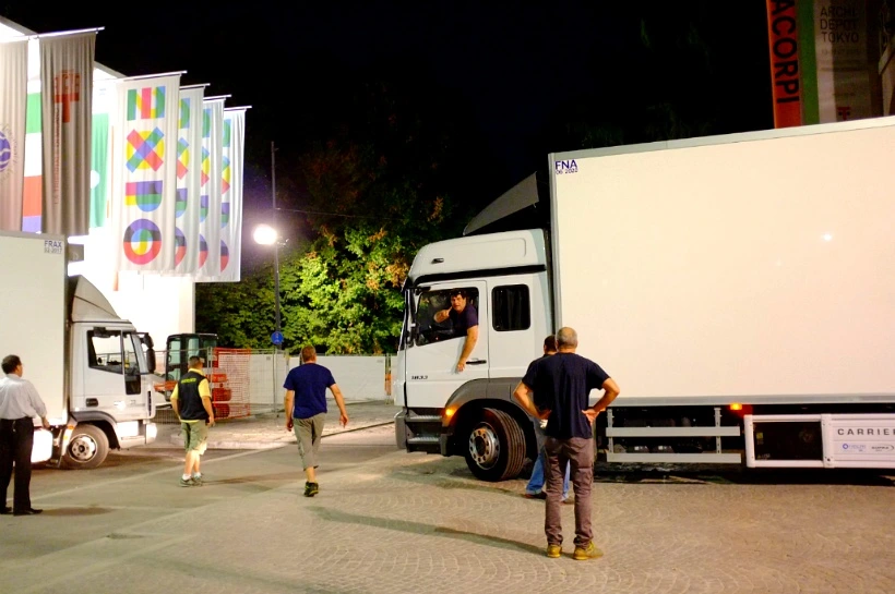 회사에 보낼 보고자료도 만들 겸 카메라를 꺼내 작업 면면을 촬영하기 시작했다. 그런데 별안간 누군가가 나를 향해 소리치는 게 아닌가. 화물차 운전석에 앉은 덩치 좋은 기사님이셨다. 이탈리아어로 하시는 말씀을 알아들을 수는 없었지만 손을 좌우로 흔드는 모양새로 추측컨데 사진을 찍지 말라는 뜻 같았다. 가까이 다가가 정중하게 내가 이 전시의 담당자(curator) 임을 몇 번이나 설명했지만 영어는 한 단어도 못 알아들으시는 눈치였다. 첫날 아침부터 분위기 험악해져서 좋을 건 없었다. 조금 억울했지만 조용히 카메라를 끄고 가방에 집어넣었다.