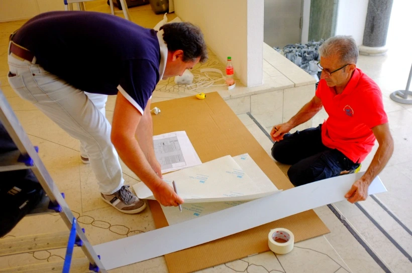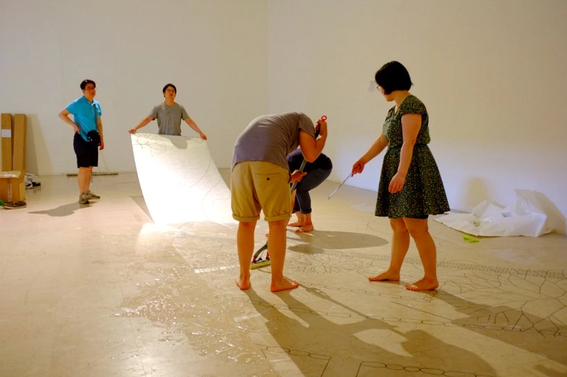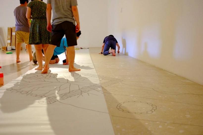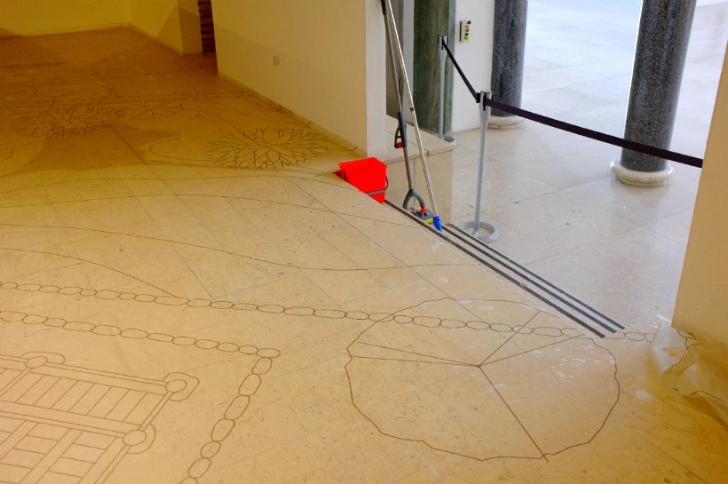 실제로 전시 개막 이후, 많은 사람들과 매체들이 이 독특한 바닥 표현에 관심을 보였다. 내마모성이 있는 반투명 필름에 인쇄된 도면은 전시장 바닥의 유백색 고급 대리석 질감과 절묘하게 어우러지며 은은한 분위기를 연출했다. 마치 대리석 바닥에 목탄이나 연필로 도면을 그린 것만 같은 착각이 들게 할 정도였다. 물론 준비과정에서 우여곡절도 많았다. 선의 두께나 농도를 확인하기 위해 실제 사이즈로 대형 출력을 몇 번이나 해가며 확인하는 과정을 거쳤고, 그럼에도 실물 대리석과의 중첩 시 효과를 확인할 길이 없어 상상력을 동원해야만 했다. 잘 마무리되어 그저 감사할 따름이다.