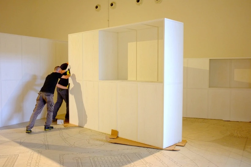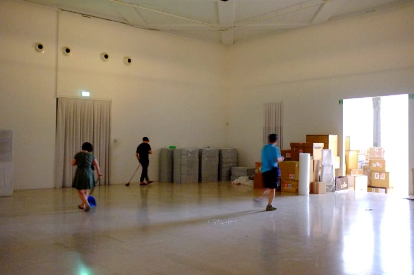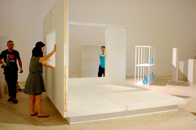 트리엔날레 미술관 건물의 정 중앙에는 작은 쿠폴라(cupola, 돔 형식의 지붕)가 있다. 그 바로 아래에 위치한 가로, 세로 각 20m 정도의 공간이 이번 전시가 열리게 될 곳이다. 미리 방문해볼 수 없었던 관계로 제한된 몇 장의 사진과 도면으로만 상상하여 설계를 진행하느라 어려움이 다소 있었다. 뿐만 아니라 전시장 자체가 역사적으로 중요한 건물이다 보니 천장, 벽, 바닥 그 어디에도 못이나 스크루 등은 사용 불가였다. 첫 전시설계치곤 상당히 까다로운 조건의 공간이었다.