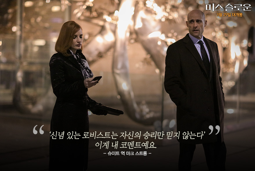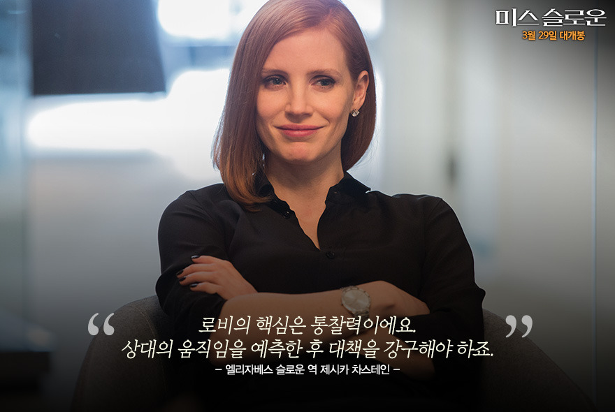 타격감. 영화를 설명하는 데 있어 굉장히 이질적인 표현이지만, 영화 <미스 슬로운>을 설명하는 데 있어 이보다 적합한 단어를 찾기는 어렵다. 시종일관 빠르고 경쾌하게 치고 올라가는 영화는, 약간의 ‘클리셰’가 됐을지도 모를 영역들마저 특유의 속도감으로 극복해나간다. 영화는 제4의 벽을 넘지 않으면서도, 이미 관객의 의중과 반응 정도는 예전에 예측했다는 듯 이야기를 풀어나간다. 그리고 그걸 가능하게 만든 건, 바로 캐릭터의 힘이다.
