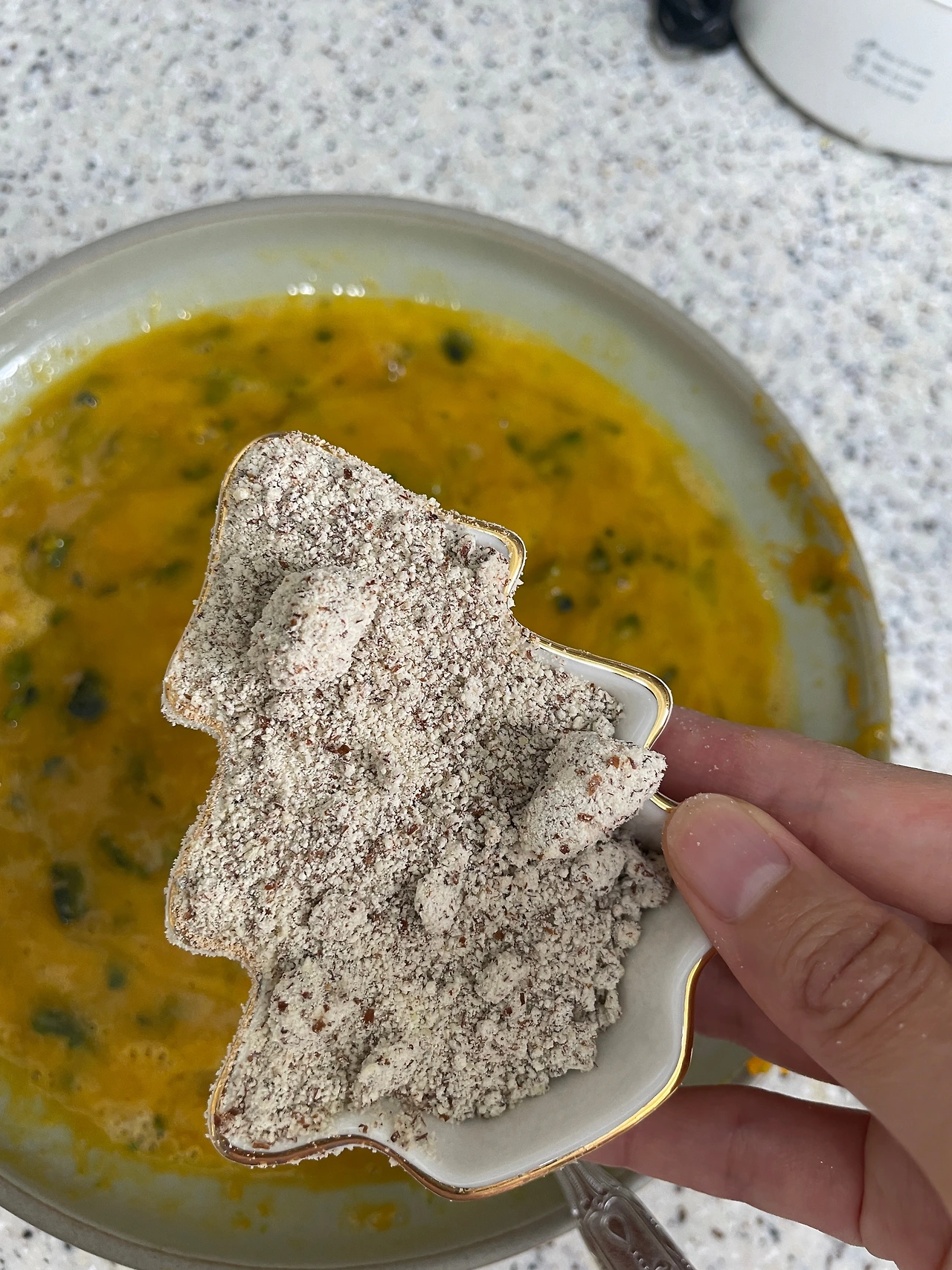 전자렌지에 쪄서 으깬 단호박에 계란을 풀고, 아몬드가루를 넣어 구우면 노밀가루 단호박빵이 된다.