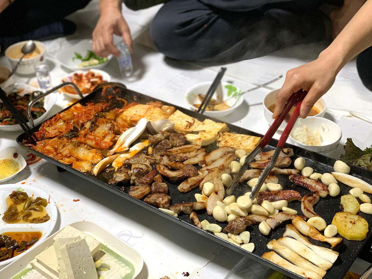 연기가 스멀스멀 올라올 때쯤 두툼한 고기를 올린다. 올리자마자 치이익- 하는 소리와 함께 온 사방에 기름이 튀고, 비탈진 팬 사이로 흐르는 기름의 통로 끄트머리쯤에 자른 버섯과 통마늘, 감자, 두부 등을 올린다. 고기 옆면 기준으로 반 조금 아래까지 익으면 고기를 뒤집고 통로에 있는 온갖 애피타이저도 뒤집어 바근바근하게 만든다.