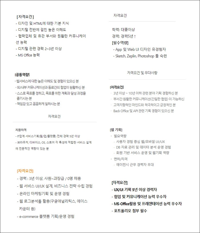 취업사이트에 들어가서 웹기획자를 모집하는 모집요강의 '자격요건'을 둘러봤다. 거의 대부분은 업무 연관성이 높거나 관련 업종의 경력직을 선호하고 자격요건으로는 커뮤니케이션 능력, 긍정적 사고, 인사이트와 같은 태도나 감각적인 자격요건부터 특정 툴의 숙련도, API관련 기획, UX리서치, 데이터 분석 등 전문적인 자격요건까지 상당히 광범위하다.